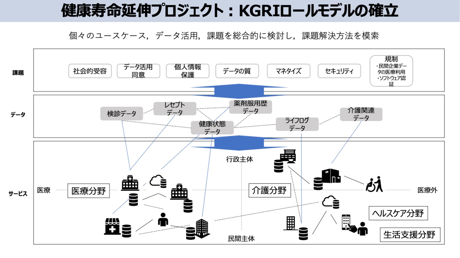 本プロジェクトは、2040年の超高齢化社会における健全なる健康寿命延伸を実現するため、様々な研究シーズを活用したヘルスケアサービスを想定し、それらを相互運用可能な形で連結する社会アーキテクチャの設計を目指す。また、医学、看護学、理工学、法学、経済学等様々な分野の視点から、システム実現に向けての課題解決検討を行う。