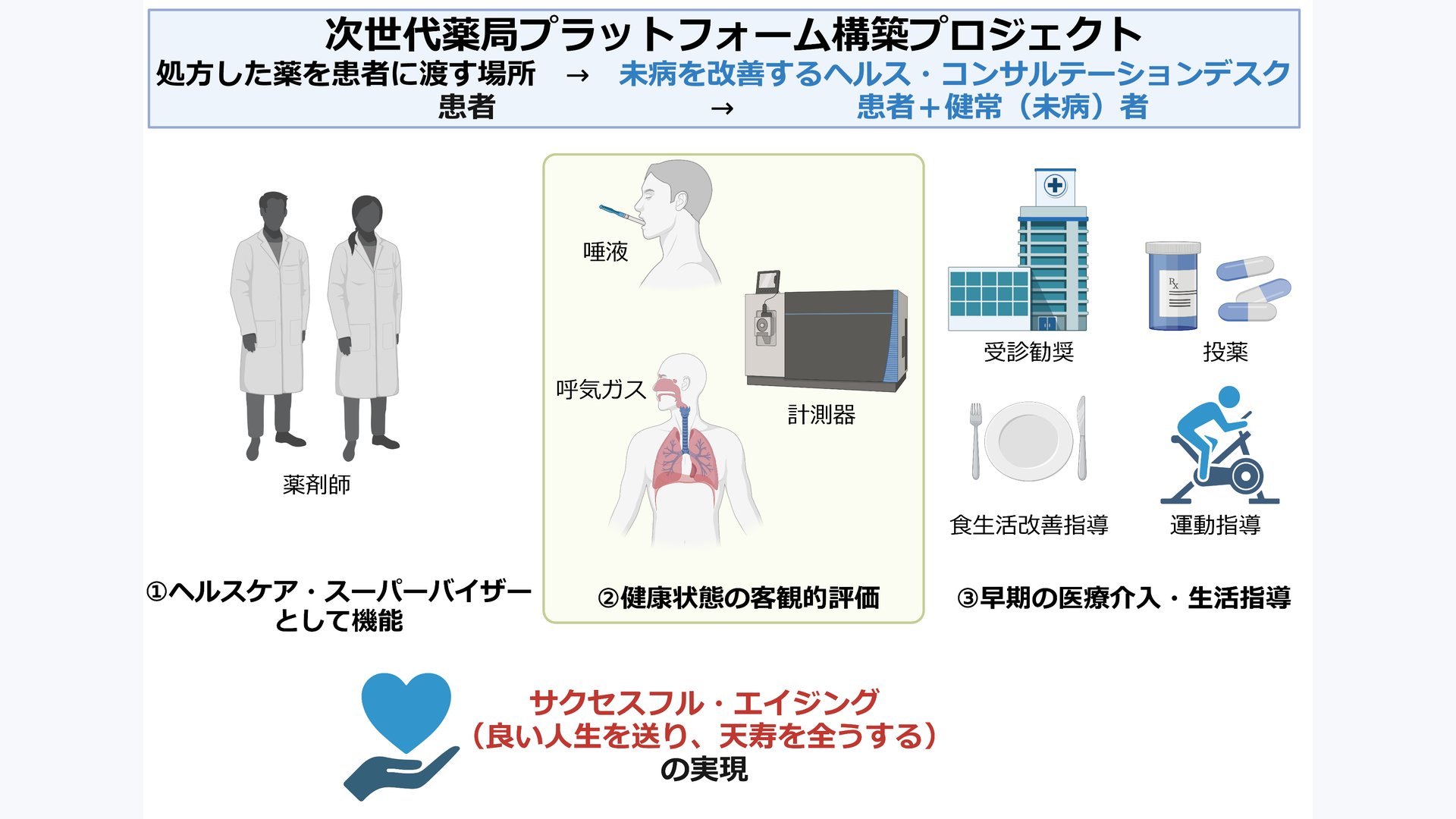 現在、薬局は大きな変革期にあり、薬剤師がヘルスケア・マイスターとしての技能を発揮することにより、疾患患者だけでなく、未病状態の人々に対して健康に関するさまざまな相談に乗り、地域の人々の健康維持に貢献する社会の"ハブ"として、大きな期待が寄せられている。本プロジェクトでは、疾患の予兆や重症化リスクを把握できるスクリーニング機器の実証実験と開発を行うことで、次世代薬局の実現に向けたプラットフォームの構築を目標とする。将来的には、住宅や会社、学校、商業施設などのあらゆる場所で取得された生体情報(バイタルデータ)をもとに、次世代薬局が適切なケアを行うようになることを目指す。