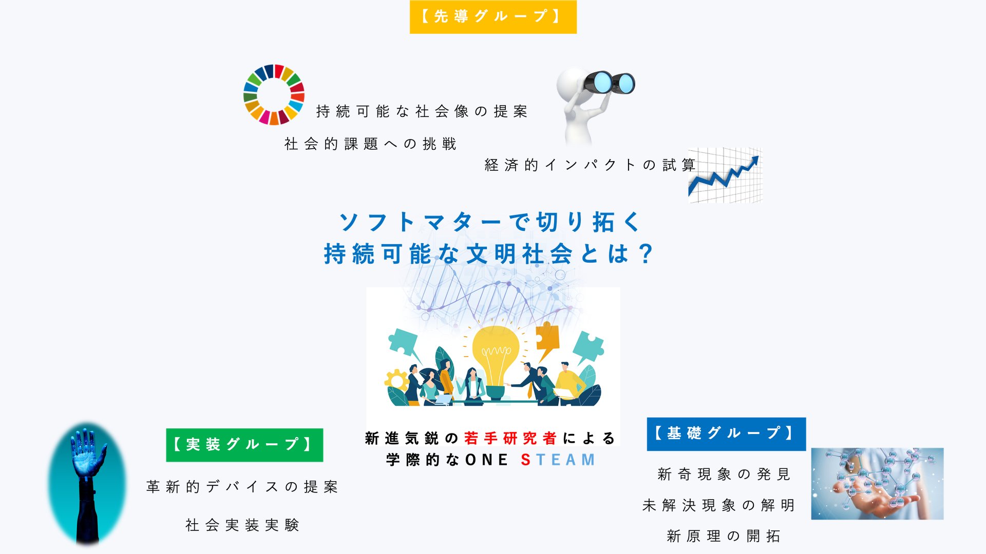 世界に先駆けて日本が直面する超高齢化社会の問題(2040年問題)の解決を目指して、世界最先端の学際的若手研究者集団が結集し、社会課題ドリブンのバックキャスト型チームが誕生しました。「ソフトマターで切り拓く持続可能な文明社会とは?」というキーワドのもとで、人間と機械の融合(社会的調和や身体的融合)をベースとした革新的テクノロジーを発明し、新生活様式としての世界標準モデルを世界に先駆けて提案することを目指します。