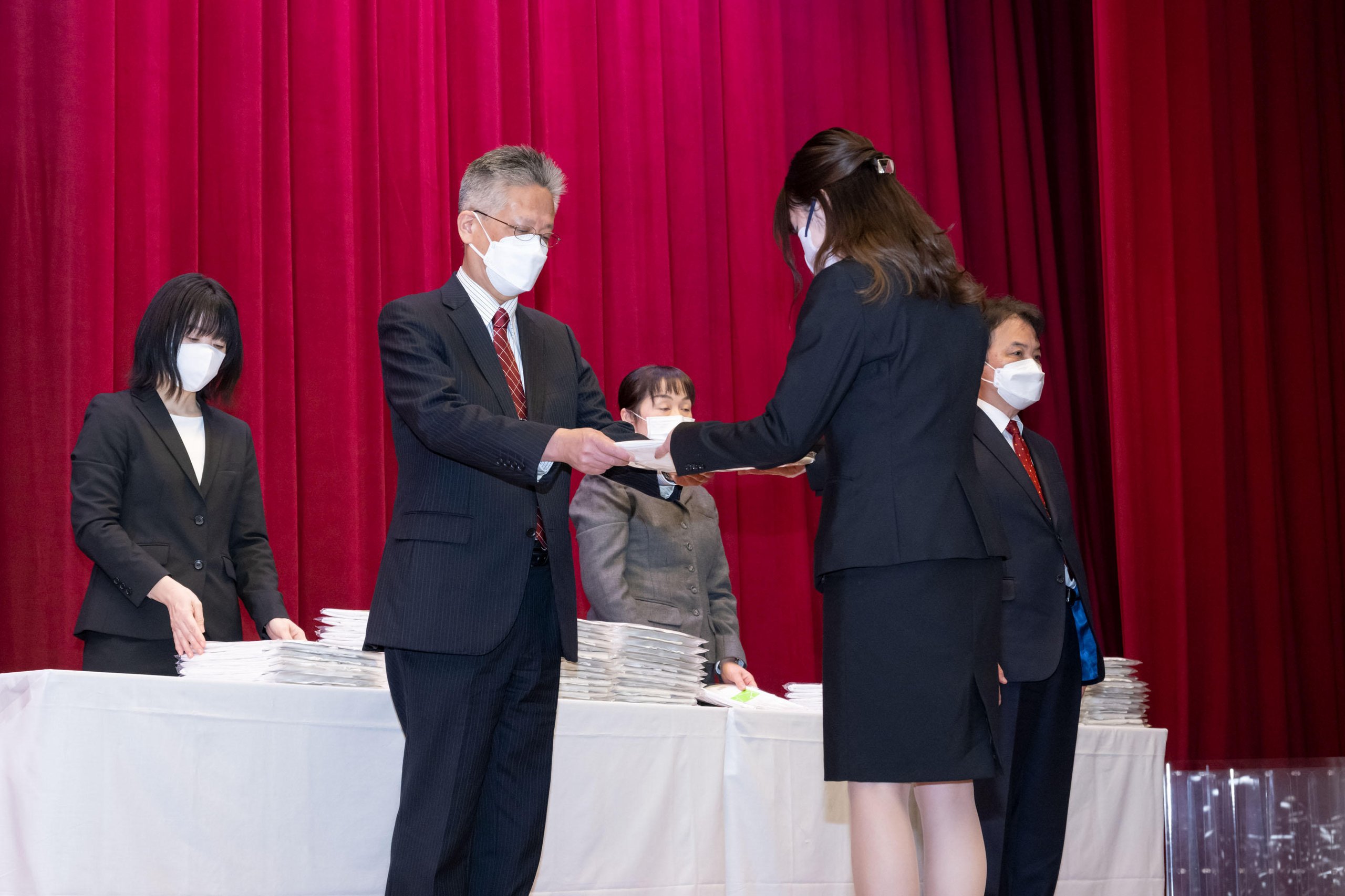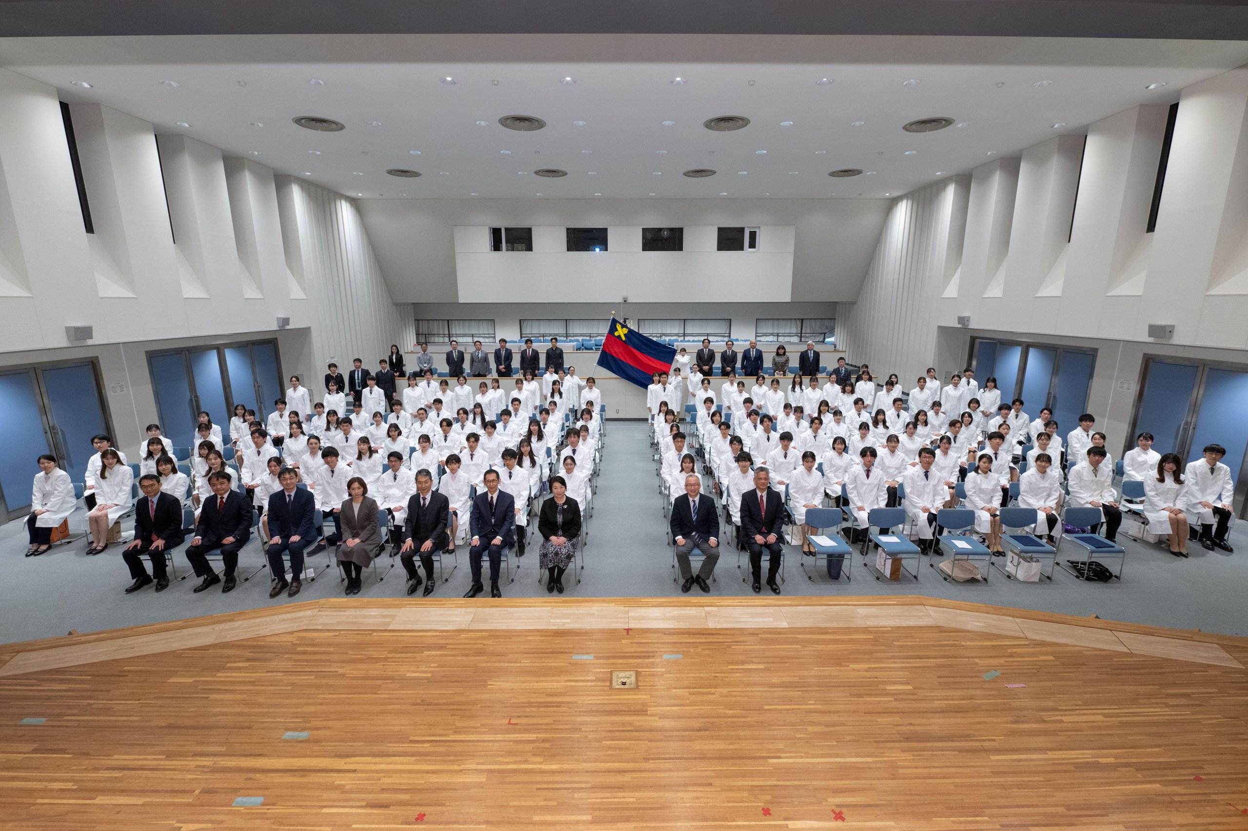 その後、三澤 日出巳 薬学部長および中村 智徳 医療薬学・社会連携センター長から、一人ひとりに慶應義塾のエンブレムを左肩にあしらった真新しい白衣が壇上で手渡されました。