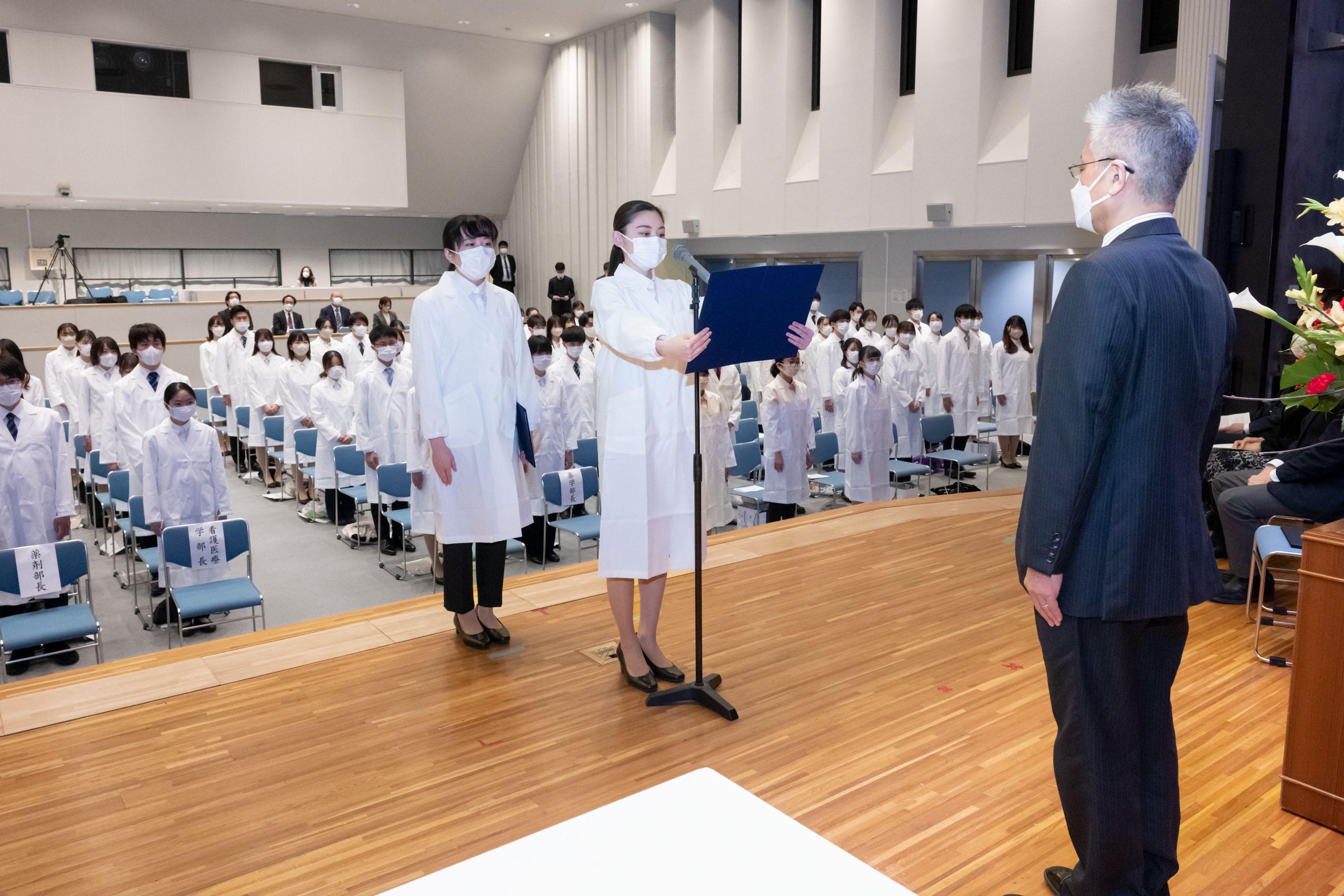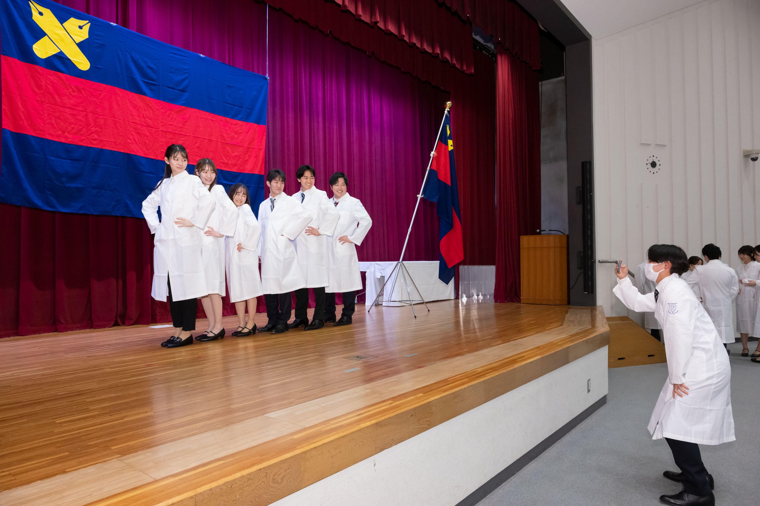 厳かな雰囲気の中、全員が一斉に白衣を着用した後、学生代表が「誓いの言葉」を読み上げ、その結びとして『医療人として、さらには人間として大きく成長し、「将来は薬剤師として社会に大きく貢献する」という自信と覚悟をもって帰ってくることをここに誓います』という決意を表明しました。