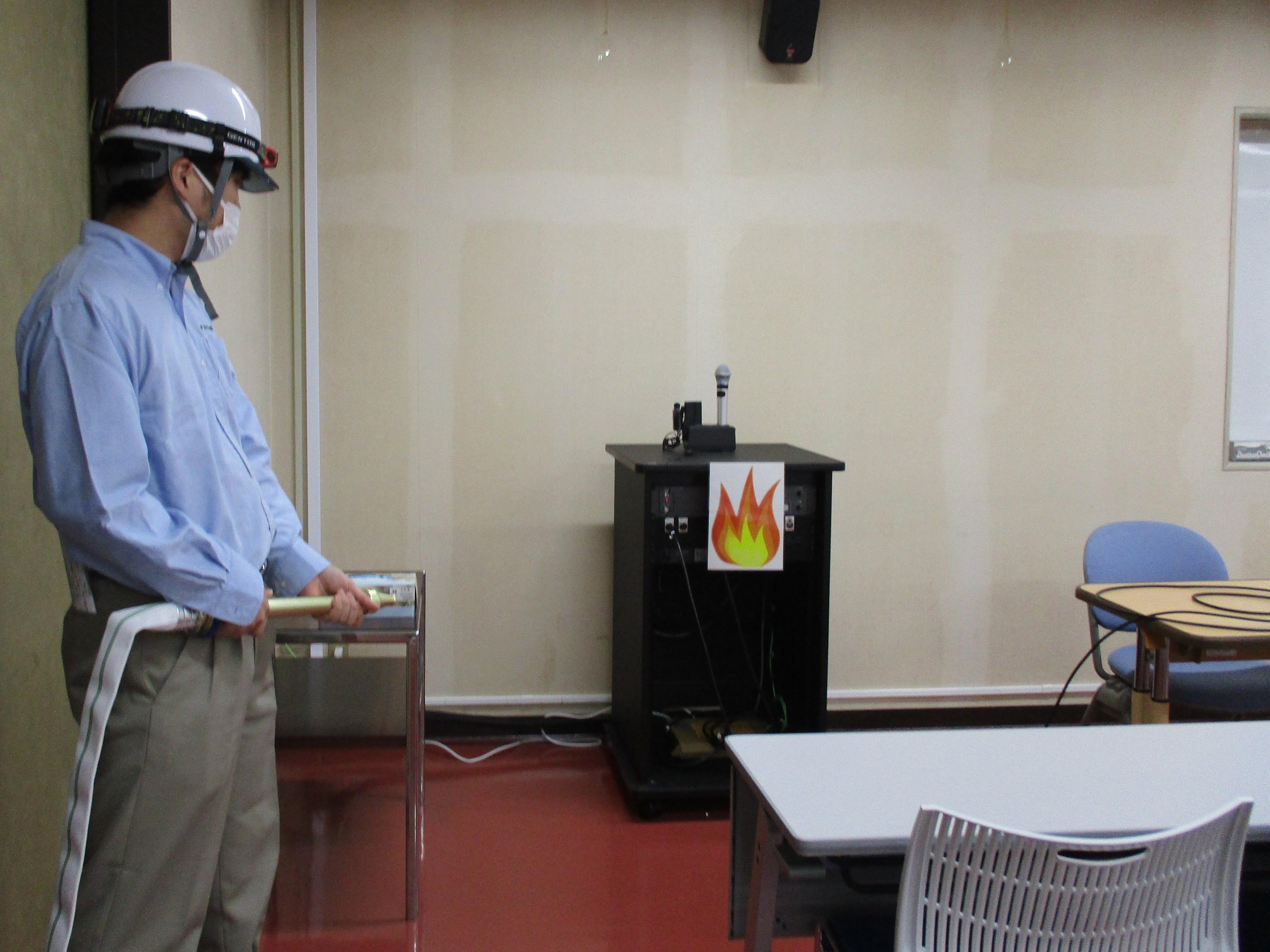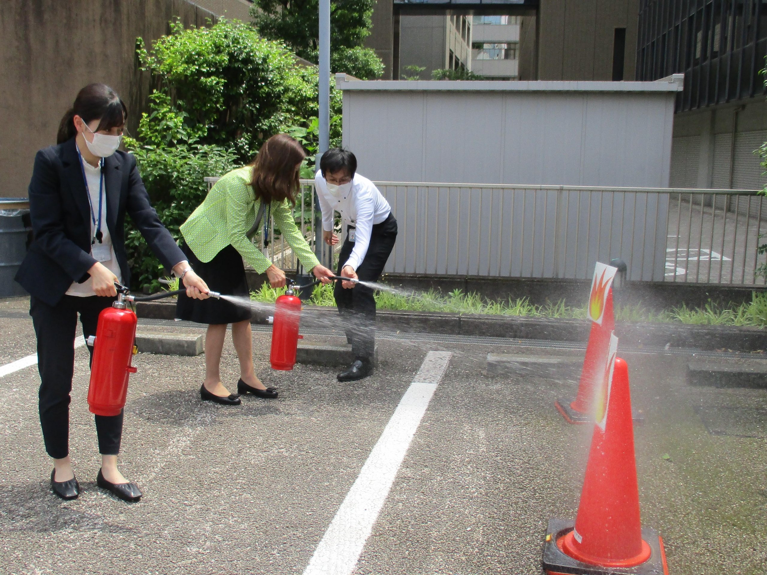 学生が参加する避難訓練と同時に、自衛消防隊員に選任されている職員を中心に、初期消火訓練・安全防護訓練を実施しました。また、教職員を対象とする消火器使用訓練も行いました。