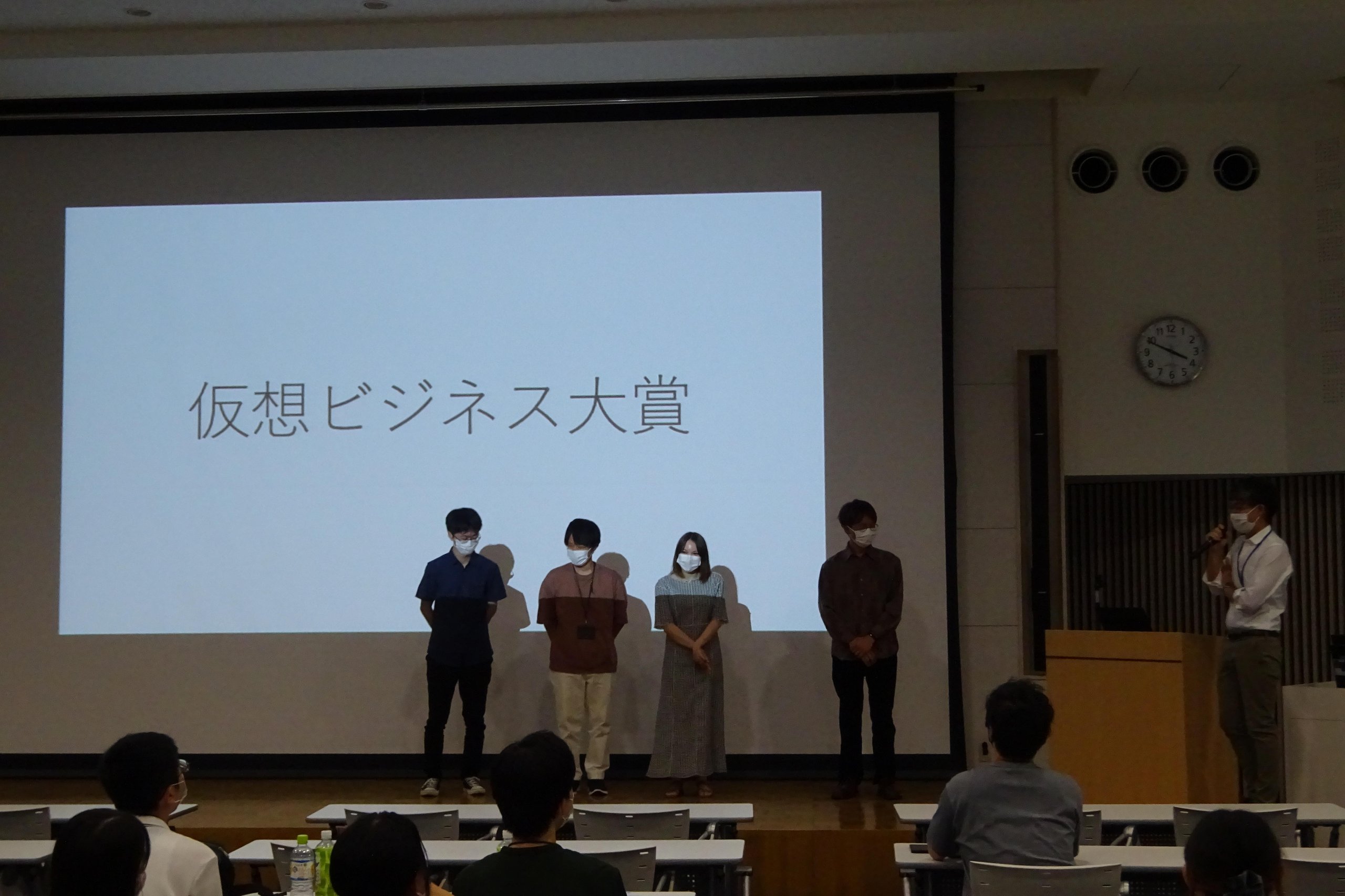 初日となる8月30日は空路で移動した後、先端生命研の学生や教員と合流しました。初日のプログラムは学生によるショートプレゼンテーションと冨田勝先端生命研所長による講演です。ショートプレゼンテーションではありきたりな発表は禁止というルールが設定されたため、学生は自身の研究の魅力や野望などを熱心にアピールしました。冨田所長による講演では、研究所の歴史に触れつつ、これからの時代を切り開く研究者としての心構えが熱く語られました。初日の終わりに、ショートプレゼンテーションをもとにしたグループ分け(社長役学生による指名制度)が公開され、先端生命研-薬研合同班の6社が翌日の仮想ベンチャープレゼンに向けて準備を進めることとなりました。