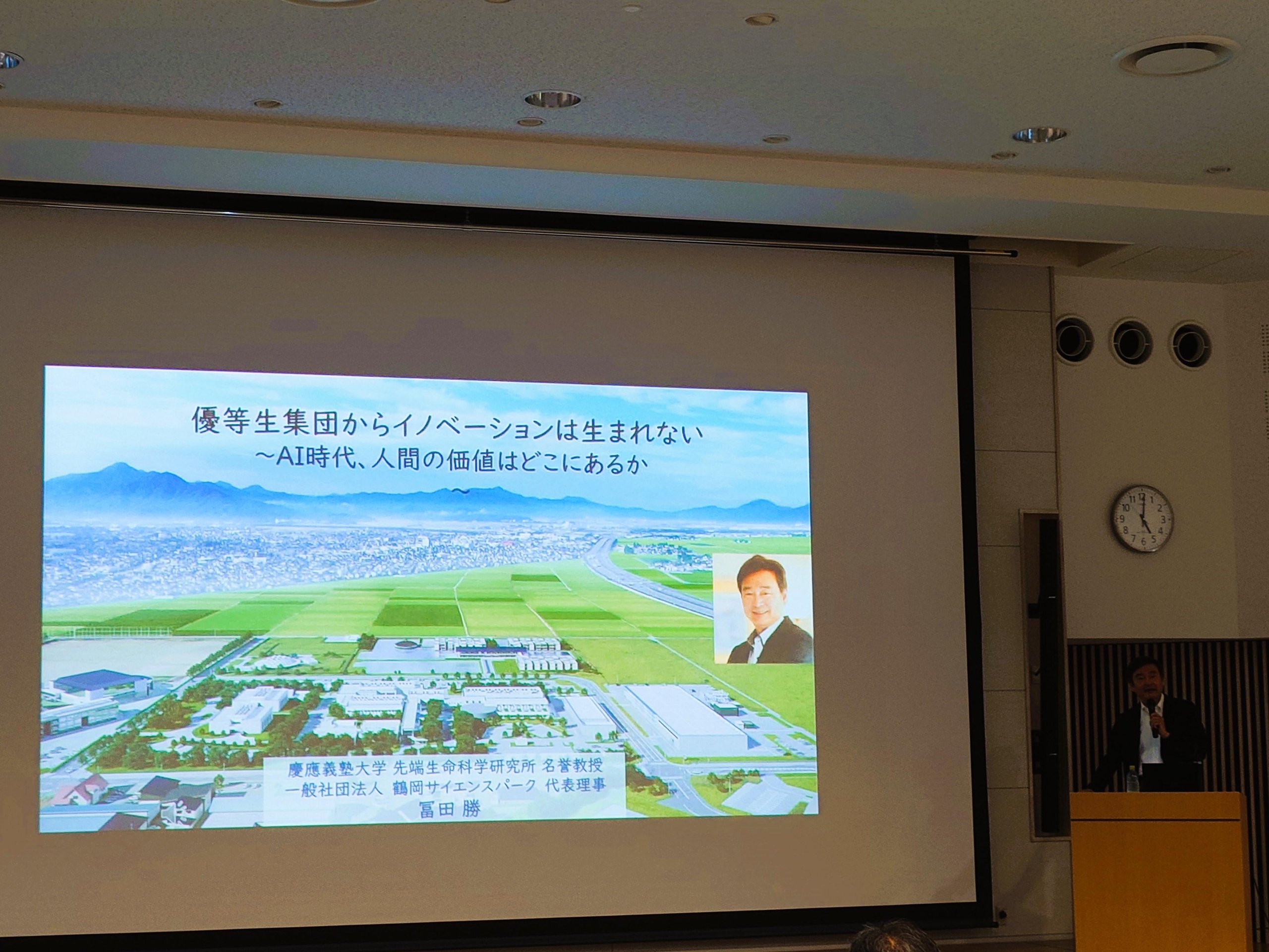 「仮想ベンチャープレゼンテーション・目指せ!鶴岡サイエンスパーク10番目のスタートアップ企業」の報告会が行われました。各班とも入念な準備を重ねた成果を惜しみなく披露しました。IABと薬研の知識を融合することで生み出されたアイデアも多く、審査員からはそれぞれの発表に対し高い評価と的確なコメントが寄せられました。