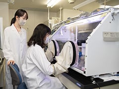 嫌気微生物の培養を行う機器です。培養庫は扉で分離された温度管理のため、チャンバー内は室温で作業が出来ます。
