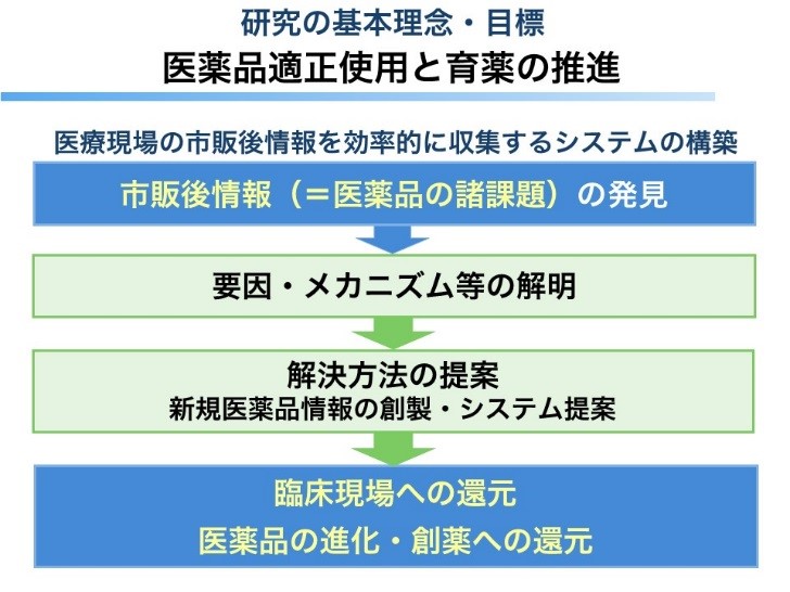 医薬品情報学講座では、医薬品適正使用と育薬の推進を研究目標として、臨床現場における諸課題(=市販後情報)を効率的に見つけ出す仕組みを新たに作り、そこから見つけ出した課題を種々のアプローチで解決し、最終的には新規の医薬品情報やシステムの実装といった形で臨床現場に還元したり、医薬品の改良・進化の提案につなげることを目指します(図2:研究の基本理念・目標)。