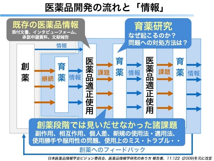 医薬品は、製造販売承認を受けた時点での情報は十分ではありません。したがって、市販後に見出されるさまざまな課題(医薬品の有効性・安全性情報、インシデント・アクシデント事例、ニーズ等)を育薬研究により解決し、得られた新しい情報を付加してより正しく安全に医薬品を使っていくこと、それらの情報を創薬にフィードバックすることが重要です(図1:医薬品開発の流れと「情報」)。このサイクルをしっかりまわすことが、医療現場においても、そして医薬品にとっても望ましい姿であると考えられます。