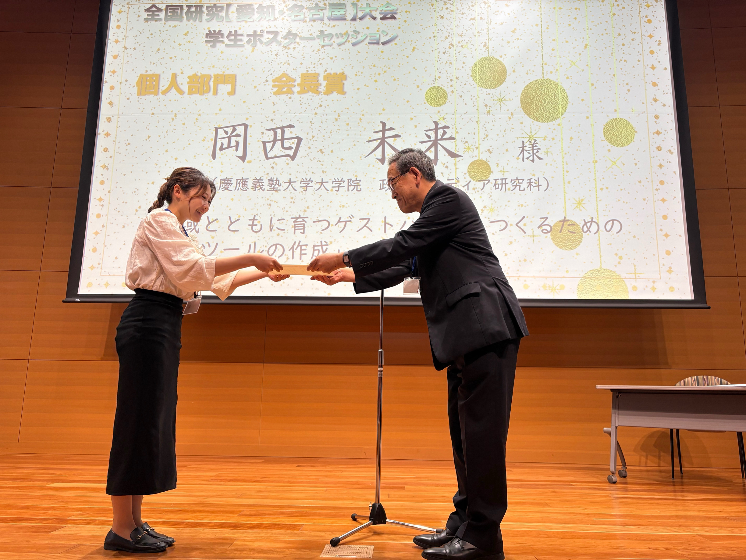 総合政策学部教授 井庭崇研究室所属の岡西未来さん(政策・メディア研究科修士課程2年)が、日本地域政策学会 2025年度 第24回 全国研究【愛知・名古屋】大会 学生ポスターセッション 個人部門で「会長賞」を受賞しました。