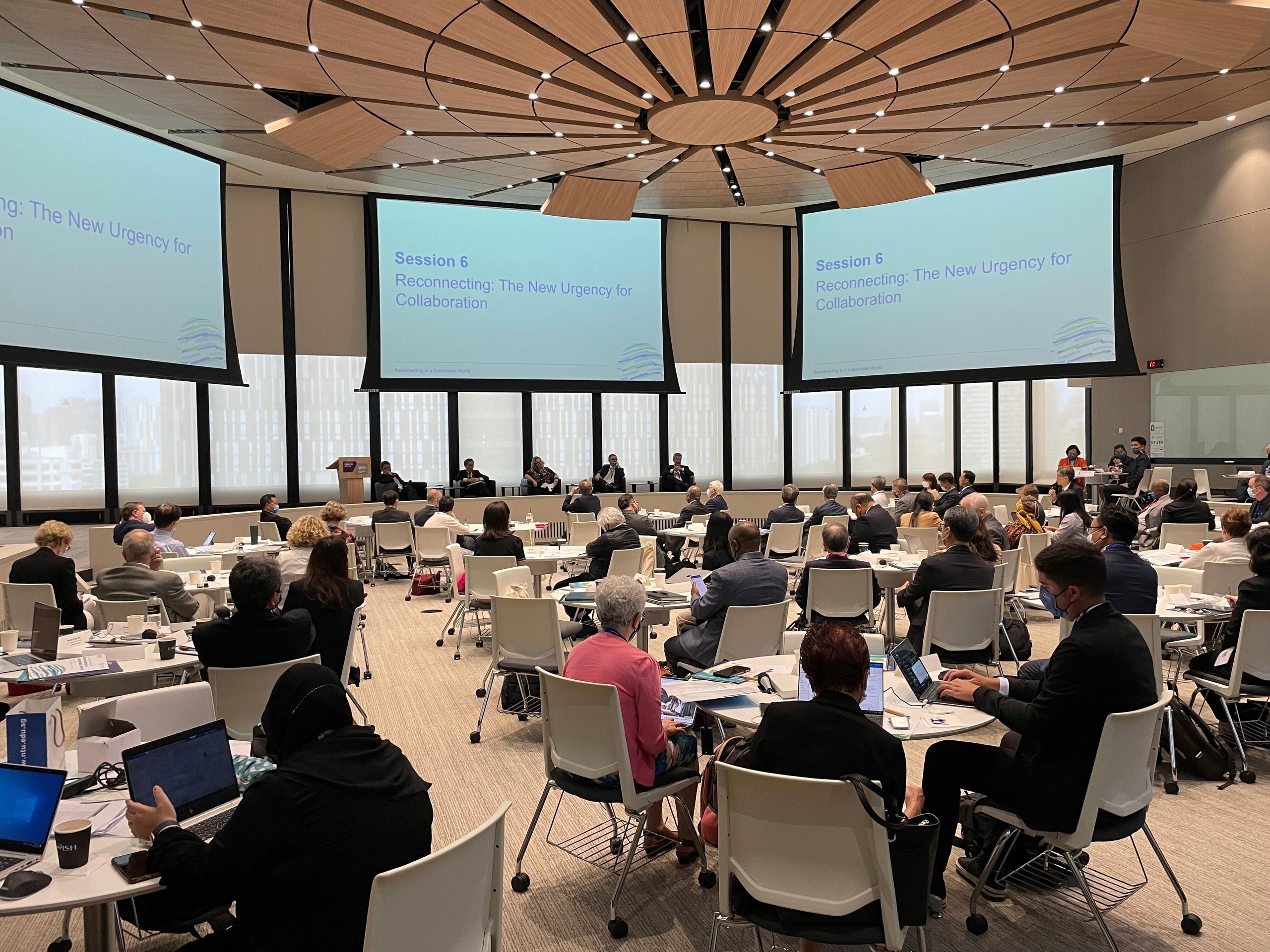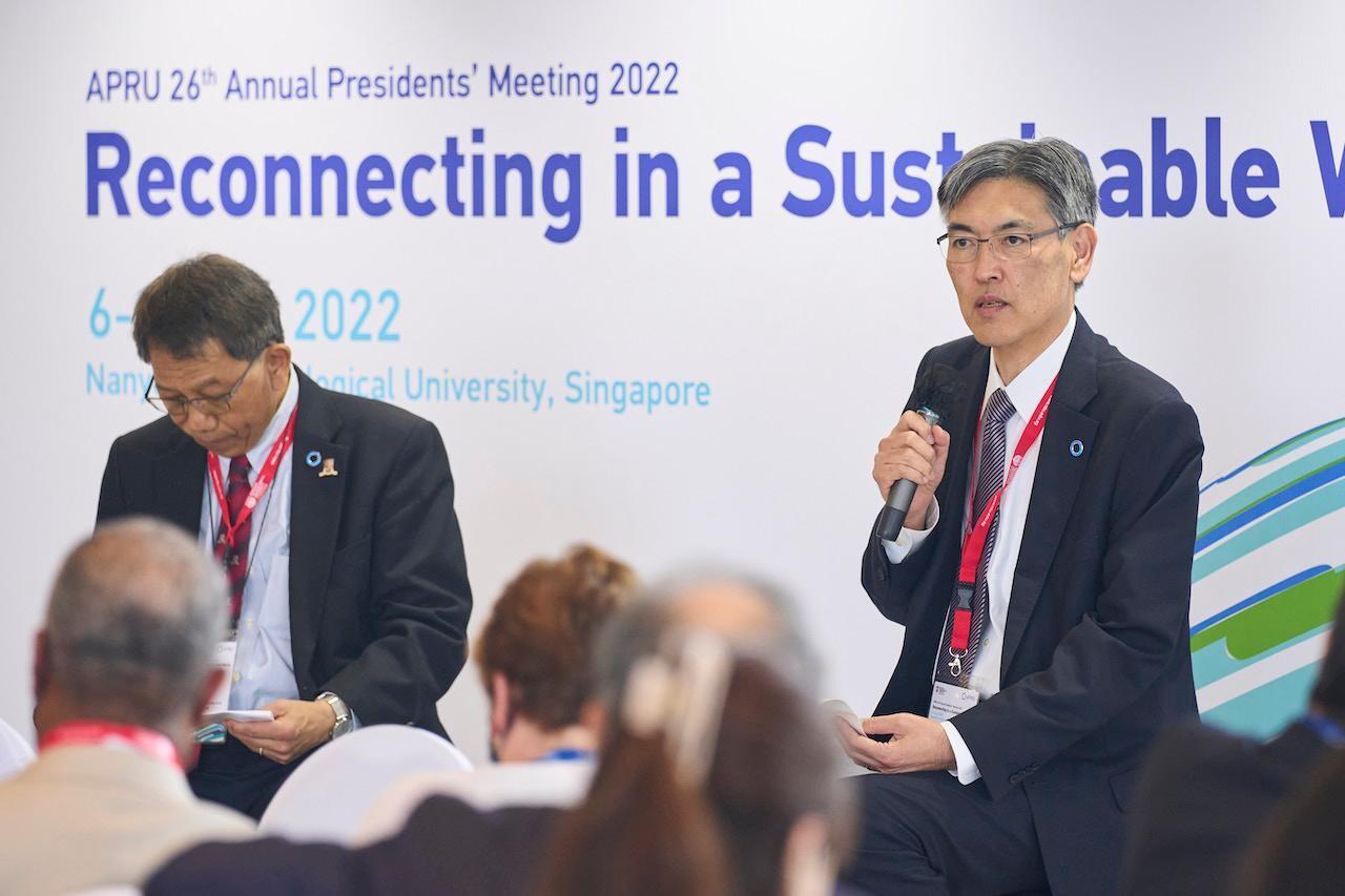 南洋工科大学が設営した夕食会場で、学生5人による太鼓の演奏が終わり、数十人の招待者が10ほどの丸テーブルに別れて着席する。環太平洋大学協会(APRU)の年次学長会合の夕食会だ。南洋工科大学の教授による気候変動のインパクトについて傾聴する。