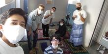 イスラーム教徒は、明け方、昼、午後、日没、夜と一日5回の礼拝をする。明け方や夜の礼拝はもちろん自宅でできるが、昼や午後、授業の取り方によっては日没の礼拝の時間も、キャンパスで過ごしているイスラーム教徒が多い。このイスラーム教徒たちが礼拝を行えるスペースが、ι館の研究室棟(5階建ての棟)の2階にある。講義棟(2階建ての棟)とつながる渡り廊下に出る手間の踊り場、アコーディオンカーテンで仕切られたいたってシンプルなつくりの一角がその礼拝スペースだ。男性と女性の礼拝場はパーティションで区切られていて、それぞれに入口がある。床の一部には簡易のマットが敷かれているが、そのほかに礼拝用の小型の絨毯が畳まれて置いてあり、礼拝する時には、その絨毯を床に敷いて、座ったり、跪いたりすることもできるようになっている。