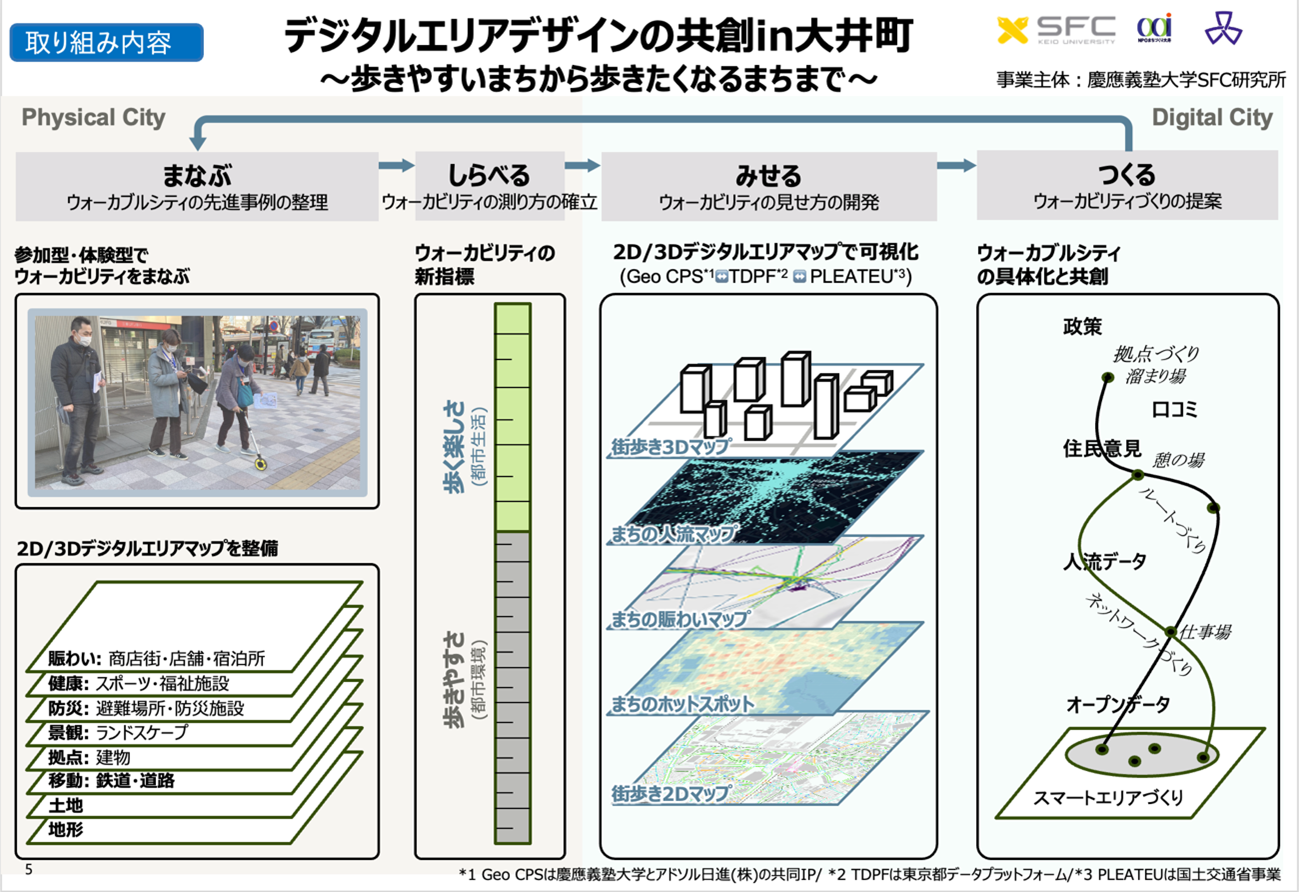 これを受けて、大井町を活動拠点に、コンソーシアム「フューチャーシティデザインスクール」(FCDS)を設立しました。FCDSでは、まちづくりの理論と実践を学び、都市空間のウォーカビリティを高め、未来型のまちづくりモデルを提案していきます。また国土交通省の「まちなかウォーカブル推進プログラム」や3Dデジタルシティプロジェクト「Plateau」、東京都データプラットフォーム(TDPF)とも連携して、研究成果を後半に広げていくことを目指しています。(図3)
