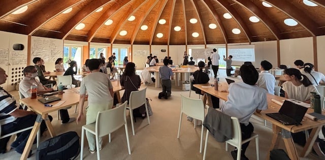 先日、8月30日(土)、学部の教職員と卒業生代表はワークショップを開催しました(写真2)。看護医療学部開設25周年記念事業の一環で、学部の未来についてディスカッションしました。会場は、未来創造塾β-1・多目的スペース。テーマにぴったりの会場で熱く議論し、その後はピザパーティで盛り上がりました。ワークショップの成果は来年6月14日の25周年記念式典で紹介されます。乞うご期待、です。
