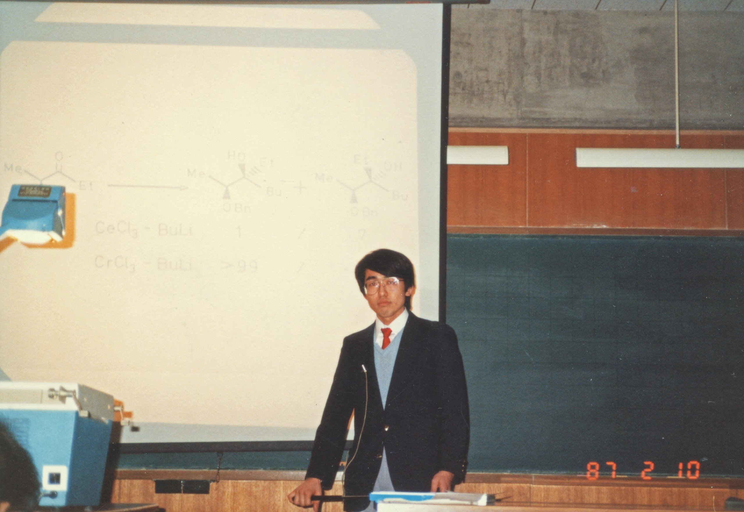 研究室での生活はとても充実していました。当時、助手を務めておられた鈴木啓介先生(現東京工業大学教授)に直接ご指導いただきました。しばしば朝9時30分の集合時間に遅れて叱られたものでした。今思うと、私は随分生意気な学生で、先生には迷惑ばかりかけていました。卒業研究のテーマは、土橋研究室で開発された反応を鍵段階とするエルダノリドと呼ばれる昆虫フェロモンの合成でしたが、「新反応開発を目的とするテーマではないからやりたくない」と我が儘を言った程でした。結局はこのテーマをいただき、トータル10段階の合成を総収率30%で完了いたしました。この結果を基に、私の記念すべき第一号の論文を先生に作成していただきました。その頃には、現金なことに、自分は立派なテーマをいただいたのだと同級生に話していました。