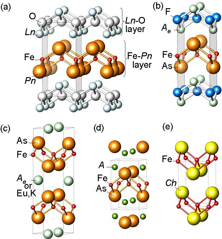 その旨を、上司に相談したところ、研究継続の了承を得ました。幸いなことに、リン(P)をヒ素(As)に置換した物質でTcが26 K に上昇しました。また、本発見を皮切りに、世界中のグループが関連化合物の探索を行い、Tcが 50 Kを超える物質まで見つかりました。図に示す結晶構造は、いずれも2008年に発見された超伝導体のものです。これらは、銅酸化物高温超伝導体に次ぐ高いTcを示すため、鉄系高温超伝導体として認識されています。