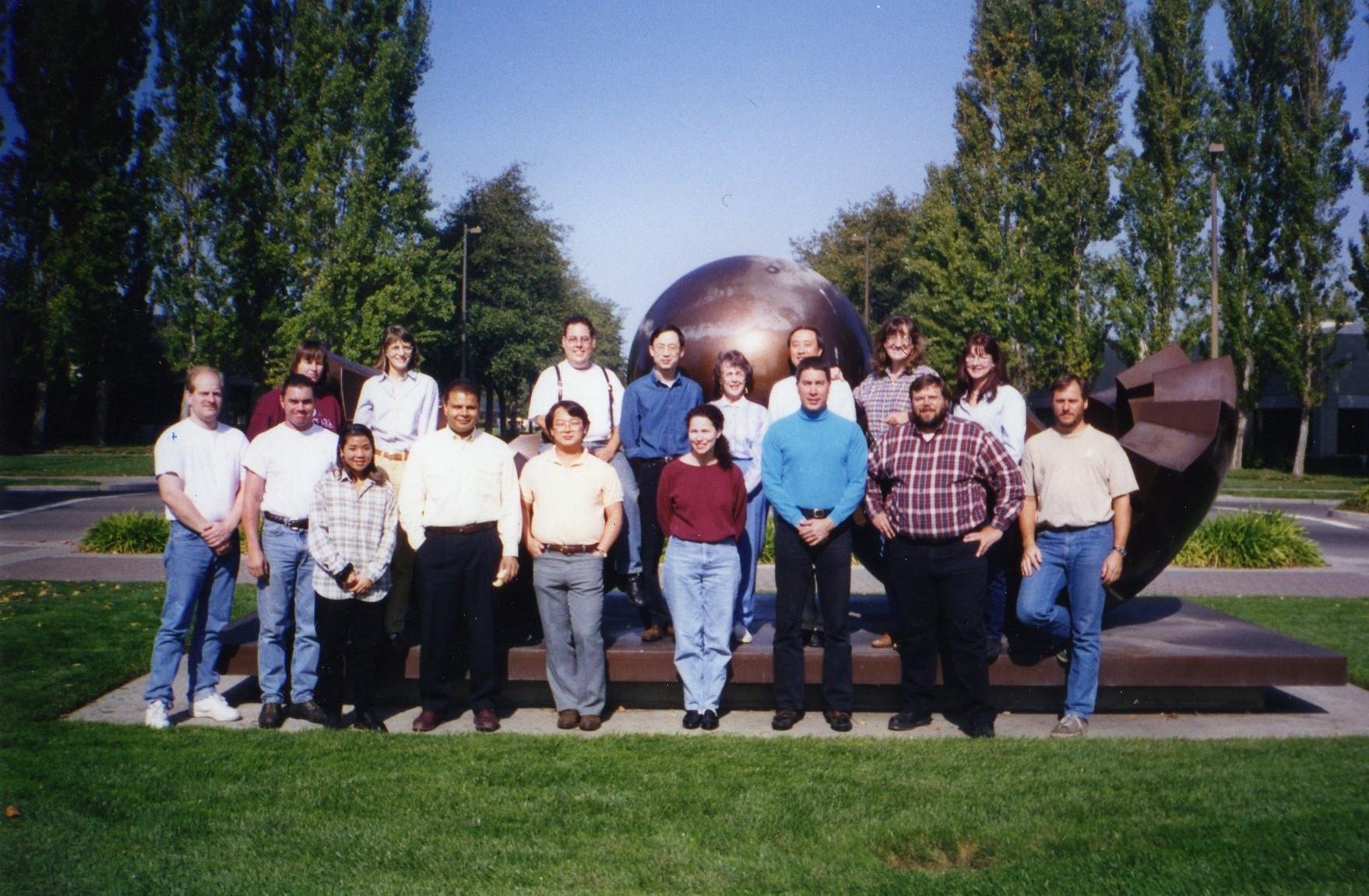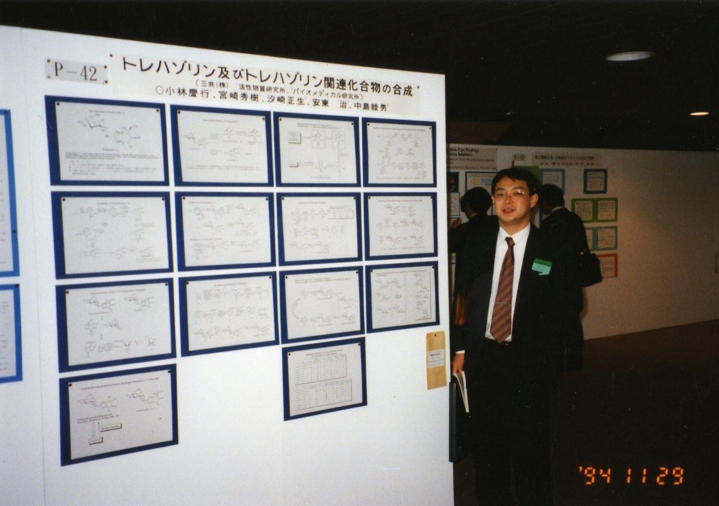 1988年に三共株式会社(現、第一三共株式会社)に入社し、その後の13年間、化学系の研究所で探索研究に従事しました。入社3年目の9月に “砂糖をベースとした新薬の探索研究”を行うグループへ異動となり、そこでは、当社で単離された糖類水解阻害剤トレハゾリンの全合成研究を行うことになりました。 “砂糖、天然物、全合成“というのが慶應時代の研究でのキーワードでしたが、製薬会社でまさかこのキーワードで仕事をするとは全く思っていませんでしたので、この巡り合わせには驚きました。1994年、この全合成の仕事で学位を取得したのですが、この後も先述のキーワードでの仕事が続きました。1995年~1998年までインフルエンザ治療薬(ノイラミニダーゼ阻害剤)の探索研究(ここでは砂糖の一種のシアル酸をモチーフにしました)を、この間に1996年7月からの1年半は米国・カリフォルニア州サンフランシスコのベンチャー企業、グライコメド社との細胞接着物質シアリルLeXをモチーフとした接着阻害剤の探索に関する共同研究に参加、帰国してからは抗生物質の合成研究をし、結局、会社での研究の軸も大学時代のものと期せずして同じになり、なんか不思議な縁を感じました。