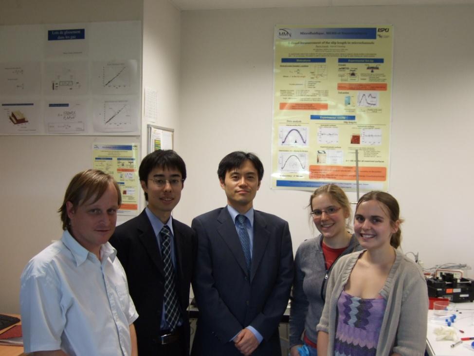 博士課程修了後、研究室の菱田公一先生のご紹介で、米国ジョージア工科大学機械工学科に研究員として滞在し、Minami Yoda先生のもと、自分が得意とする微細な流路内の流れの測定法について更に研鑚を積みました。日本と比べて一長一短ですが、米国は上下関係もなく研究室間、学科間の交流も活発な環境で、私も思う存分研究に取り組みました。また、台湾人、トルコ人、中国人との共同生活も新鮮な経験で、現地日本人の方々との交流もあり、研究と遊びのメリハリをつけながら米国生活を謳歌しました。その後、東京大学工学系研究科応用化学専攻の北森武彦先生からお誘い頂き、これまでの微小空間の流れの研究に加えて、マイクロ化学システム全般に関わる研究に取り組むことになりました。現在は、数10μmのさらに1/100で、学術的にこれまで未踏の領域であった数100nmという極小空間の流れの研究や、これを用いた分析デバイスの研究に取り組んでいます。化学、バイオや材料工学など様々な分野の研究者と議論しながら、新たな科学・工学分野を開拓すべく、学生と一緒に四苦八苦しながら研究する毎日を過ごしています。