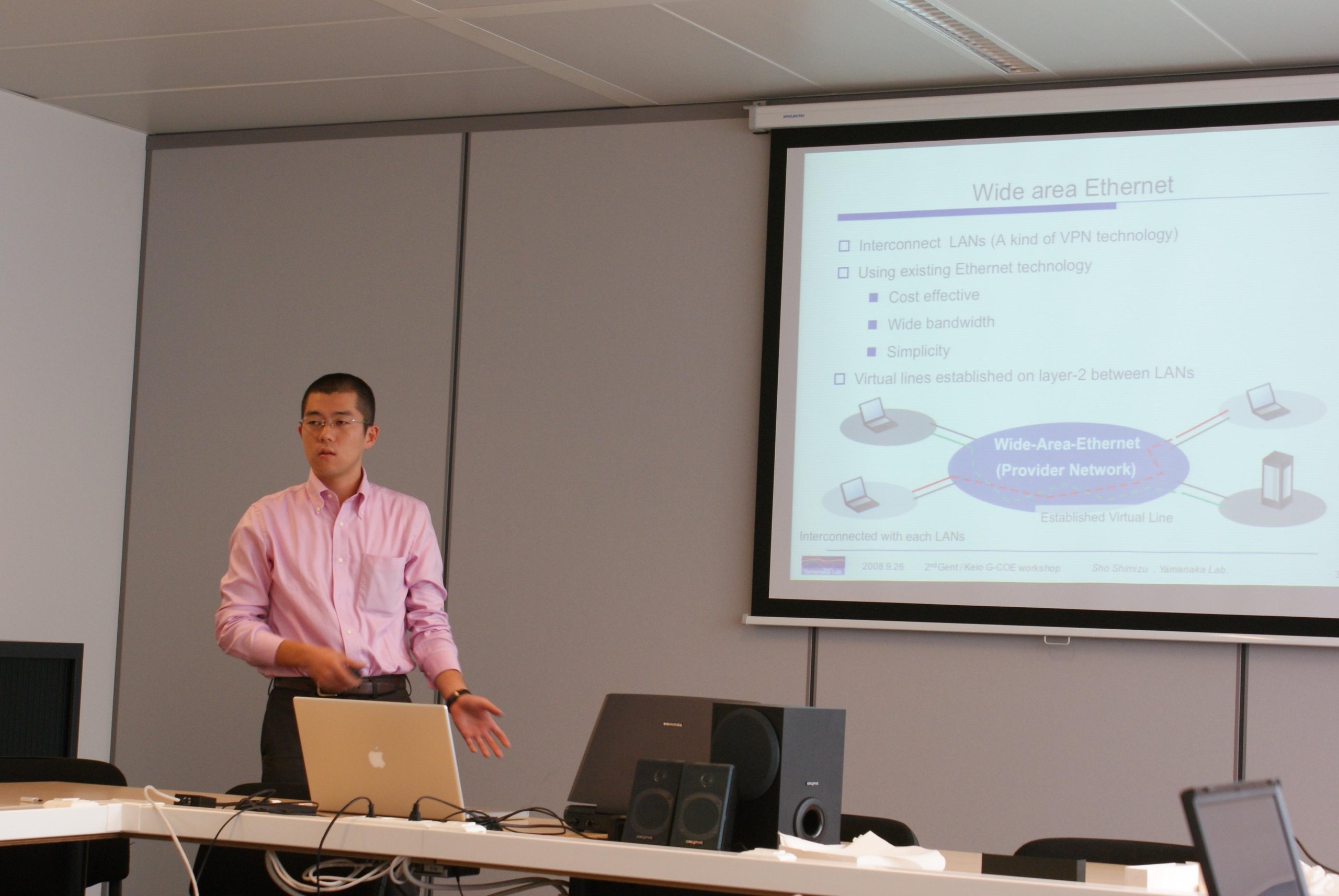 また、G-COEの国際インターンシッププログラムで、ベルギーのゲント大学に2ヶ月+1ヶ月の計3ヶ月短期留学しました。ゲント大学では、Piet Demeester教授のグループで現地の先端的なネットワーク実験設備の上に、山中研究室で開発した実装とゲント大学で開発した実装を載せて国際相互接続実験を行いました。この研究成果をまとめた論文が最終的に電子情報通信学会の論文賞になりとても自信になりました。