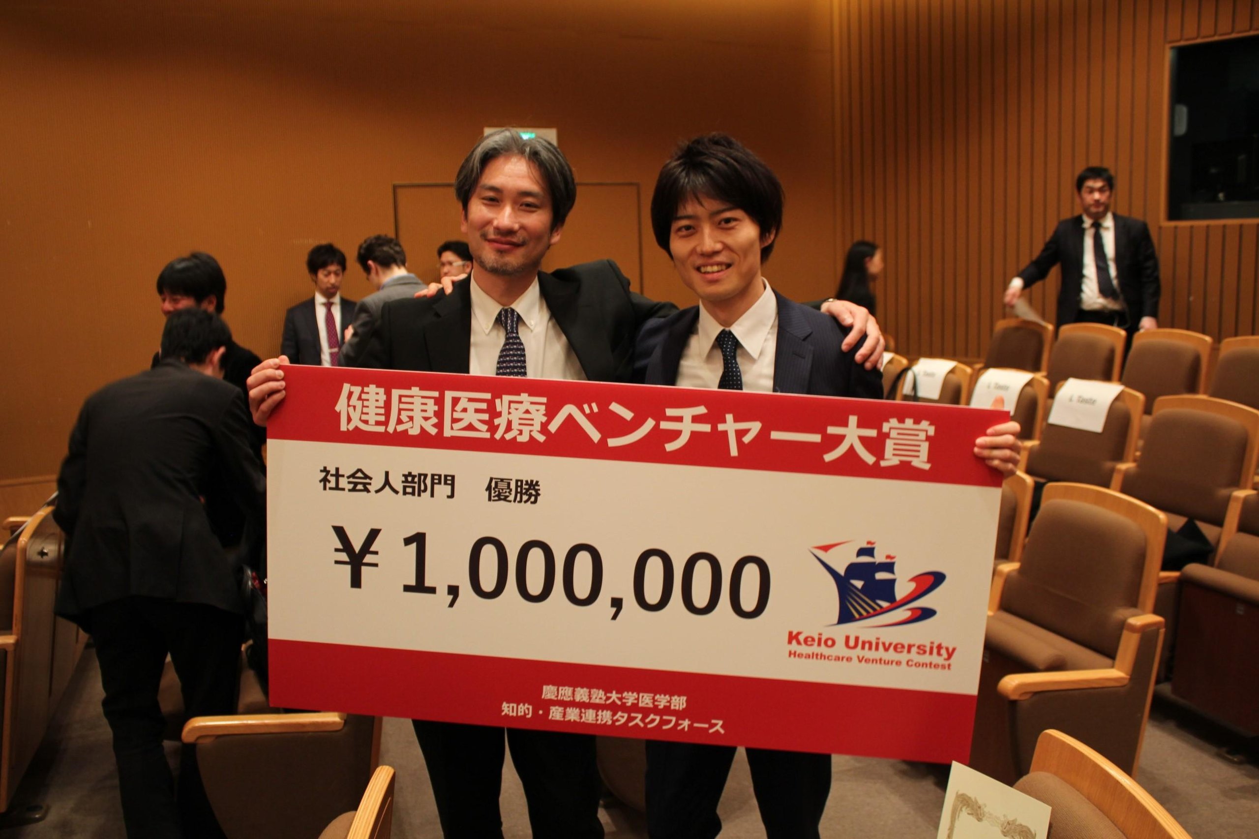 そこで、修士からひっそりと進めていたプロジェクトで起業することにした。これは、塩をほとんど摂ることなく塩味を感じさせる技術で、腎臓病の患者さんのように塩分制限が必要な方が、楽に減塩をできるようにするためのものである。具体的には、歯にソルトチップを貼り付け、これをなめながら食事をすることで、塩をかけていない料理でも、塩味が効いた形で料理を楽しむことができる。実際に技術が形となった2017年に慶應義塾医学部主催の「健康医療ベンチャー大賞」に出場し、優勝を果たした。100万円の賞金もさることながら、祝賀会にてあの坪田先生に会えた(だけでなく、ちゃっかり本にサインも頂いた!)ことが望外の喜びだった。