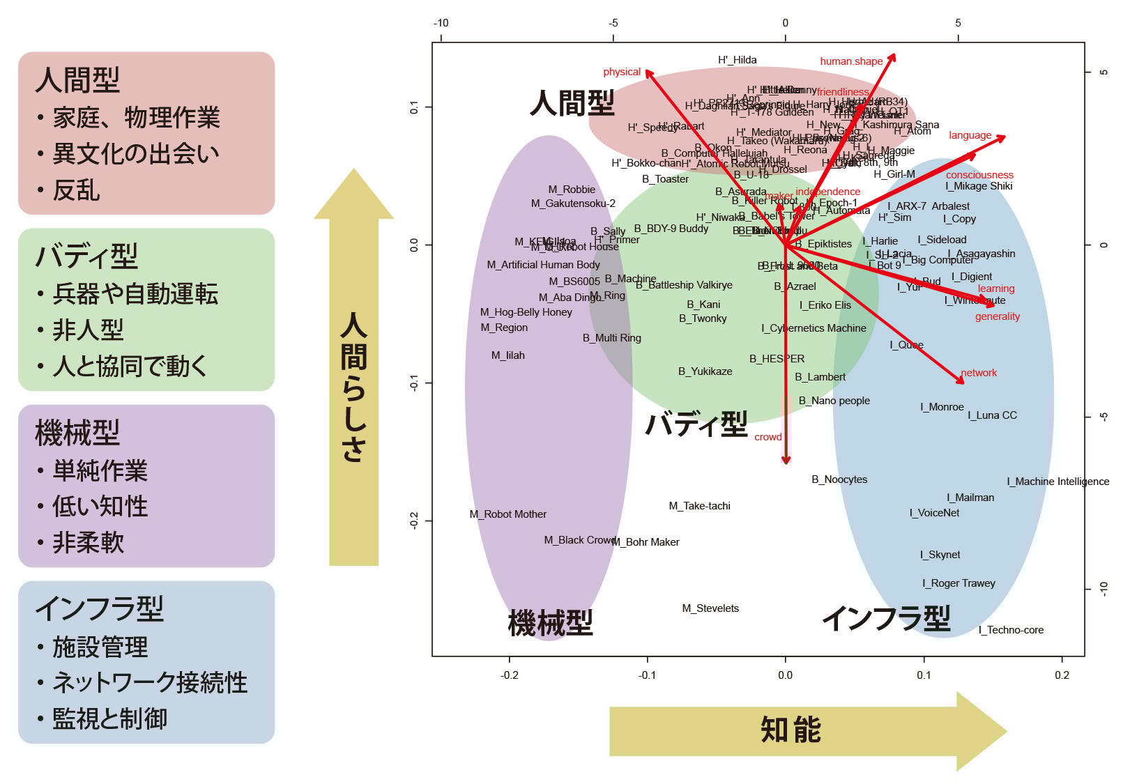 SFに登場するAIのキャラクターを分類したのが図3だ。自律性や親しみやすさ、ネットワークの広さ、言語能力などいくつかのパラメーターに従って、クラスタリングと主成分分析という統計的な手法で分類し、SFに描かれるAIに、大きく分けて4種類の型があることがわかった。「人間型と機械型は昔からありますが、その中間にあるバディ型やインフラ型の領域に、新しいエージェントの可能性を見ることができます」と大澤さんは話す。現在は、大学内に「サイエンスフィクション研究開発・実装センター(SU)」を設立し、拠点として研究を進めている。