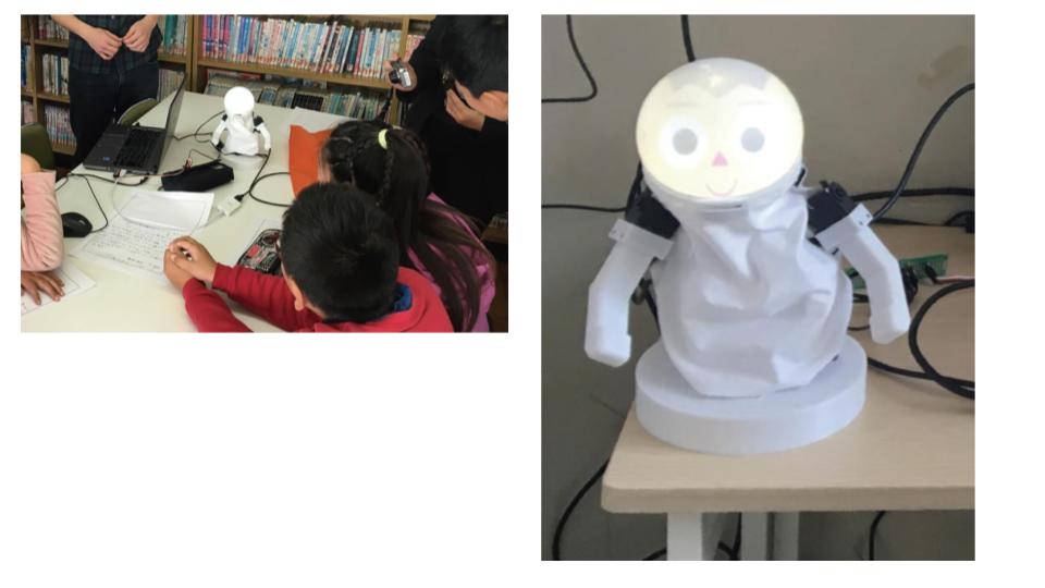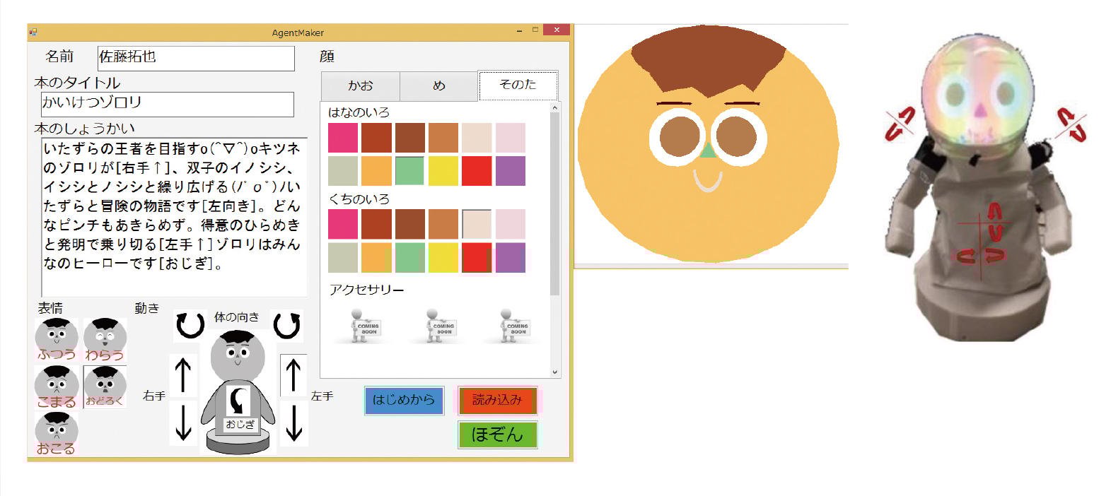 つくば市の小学校で実際に使用した「図書紹介ロボット」は、ロボットを通じて子どもたちの読書コミュニティを活性化した成功例だ(図2)。児童がパソコンに紹介したい本と紹介文などを打ち込むとその本の名前が登録され、画面上にある本の名前をクリックするとロボットが表情と動きを交えながら音声で本を紹介する。ロボットの表情(顔の動きや色)を設定できることが大好評だった。「上級生が下級生に自発的に作り方や使い方を教えている姿がうれしかった」と大澤さん。エージェント自身が助けるだけでなく、エージェントがいることでその場が活性化されるようなロボットを、大澤さんは「触媒的なエージェント」と呼んでいる。