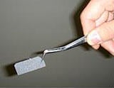 写真の中でピンセットで挟んでいるものに「永遠の輝き」はありません・・・(灰色!)。しかし、これは正真正銘「ダイヤモンド」なのです。数ミクロンという小さなダイヤの粒が敷き詰められて板状になっているのでこのように黒い色をしているのですが、実はこのダイヤモンド、血液中や尿中の尿酸値、血糖値、あるいは地下水中のヒ素、金属や環境ホルモンなどの濃度を瞬時に、正確に、しかも微量でも測定することができる「高感度センサー」として利用できる可能性があるのです。これが、今注目されつつある新材料「ダイヤモンド電極」です。
