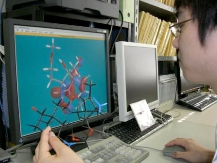 さて、できた化合物は思った通りの構造を持っているでしょうか?この構造決定の部分はハイテクです。ここ30年ほどで革新的な進歩がありました。ごく微量(1 mg程度)のサンプルの核磁気共鳴スペクトルで、水素原子や炭素原子の結合のしかたや三次元的な構造がわかります(画像6)。また、マススペクトルを測定すれば、その化合物の分子量がわかります。首尾よく望みの化合物が得られれば、これを原料として、次の反応を試みます。この操作を連続的に複数段階行って(化合物によっては50工程以上を要することもあります)、すべての工程がうまく進行すれば、狙った化合物を合成することができます。もちろん、すべての工程が思い通りに進むとは限りません。むしろうまく行かない場合(反応が進行しない、化合物が分解してしまうなど)のほうが多く、この場合は合成ルートの再検討が必要となります。想定とは違った反応が進行する場合もあります。しかし、狙った化合物とは構造が違う!とがっかりしてはいけません。こんな時はある意味チャンスです。未知の新しい化学反応を見つけ出すことができるかもしれないのですから。得られた化合物の構造を決めて、なぜそんな化学反応が進んだのかを考えます。紙とエンピツと分子模型—ローテク3点セットの再登場です。最近ではコンピュータを用いた分子軌道計算や分子力学計算というハイテクの助けを借りることができるようになりました(画像7)。