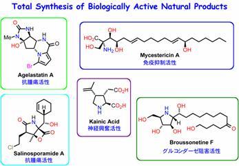 身近な有機化合物といえば、食料、衣服、プラスチックなどがすぐに思い浮かびます。また風邪をひいた時などは、解熱剤や抗生物質といった「くすり」のお世話になることもありますね。トリカブトの毒やフグ毒などこわい有機化合物もあります。くすりや毒の作用を示す化合物は「生物活性物質」と呼ばれ、「くすり」の候補となるものです。複雑な化学構造を持つものが少なくありません。これらの化合物の多くは天然(植物、動物、土の中や海に住む微生物など)から得られますが、ごく微量しか得られないことがままあります。よってこれらを「くすり」として開発するためには、天然の化合物と一部異なる構造を持つ誘導体を得ることも含めて、人工的に合成すること(化学合成)が必要となります。応用化学科分子有機化学研究室は、強い生物活性を示し、複雑な構造を有する生物活性物質をいかに造るか、ということを主要テーマのひとつとして研究を進めています。