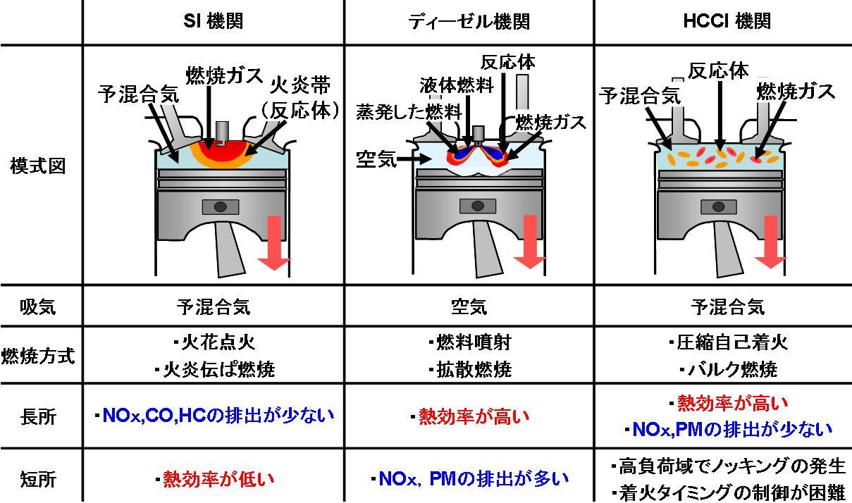 HCCIエンジンは第3の燃焼といわれる「予混合圧縮自己着火燃焼」を基本とします。空気と燃料をあらかじめ混合して燃焼室内に導入し,ピストン圧縮により着火・燃焼させるエンジンです.この燃焼方式は,従来は火炎伝ぱ燃焼が不可能といわれた予混合気でも着火および燃焼が可能です.燃料濃度が薄い予混合気(超希薄),あるいは多量のEGRガスで希釈した予混合気(超希釈)でも燃焼させることができます.低温燃焼が実現され,有害排出ガスである窒素酸化物(NOx),すす(PM)が燃焼の過程で生じません.低温燃焼は,エンジン燃焼室の壁面から熱が奪われるのを防止することが出来るので,熱損失が少ない高効率エンジンが実現できるものと期待されています.