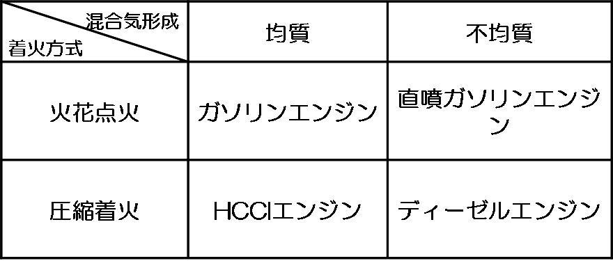 Ashleyは,エンジン燃焼を表1に示すマトリックスにて分類しています。着火の方式を「火花点火」と「圧縮着火」に分類し,燃料と空気の混合気の形成を「均質」と「不均質」に分類しました.