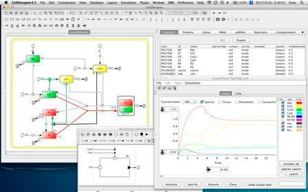 システム生物学でのネットワークは分子(タンパク質や遺伝子)間の相互作用を表します。相互作用は生化学反応であり、個々の反応は速度を持ちます。すべての生化学反応が明らかになれば生物はネットワークとして表現することができます。ネットワーク中のすべての生化学反応に正しい反応速度式を与えることができれば、ネットワークとなった生物は更には連立微分方程式に形を変えます。これを私達は数理モデルと呼びます。数理モデルとなった生物はコンピュータ上で数値積分を行うことでシミュレーションすることができます(図1)。生命現象を数理モデルとして記述することで、現象を支配する機構、仕組みを明らかにすることが出来ます。