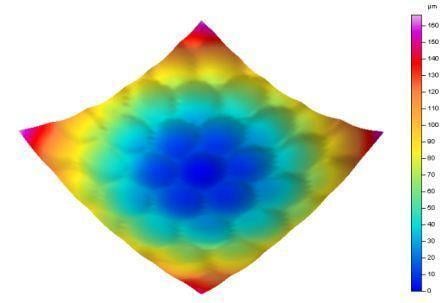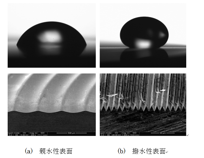 図1は、複眼の模擬構造としてナノ切削によって製作したマイクロレンズアレイの表面計測結果です。図2は、銅表面に深さ数ミクロンの微細溝を切削することで親水性や撥水性をもたせた事例です。このように、溝形状や深さを変化させることで表面の濡れ性を自由自在にコントロールすることができています。