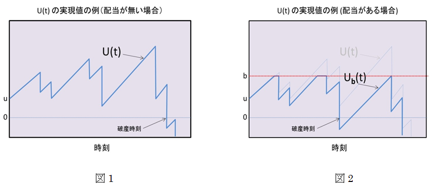 ここに、U(t)とは時刻tにおけるサープラスの額で、uは初期サープラス、cは保険料率を表す正の定数、S(t)とは時刻tまでの保険金支払総額を表しています。つまり、このモデルでは、単位時間当たりcの保険料収入があり、それが、サープラスの増加に寄与しています。一方で、保険金支払により、S(t)だけサープラスの減少に影響を及ぼしていると言えます。さらに、右側の式を見てみると、N(t)とは時刻tまでの保険金請求頻度を表し、Xiとは第i番目の保険金支払金額を表しています。つまり、保険金支払総額S(t)には、頻度に関わる不確実性と支払金額に関わる不確実性という2種類の‘不確実性’が含まれており、複合ポアソン過程と呼ばれる確率モデルの1つとして知られております。 この古典的リスクモデルを応用した研究分野の1つに、株主配当問題についての研究があります。具体的には、図1のようなU(t)の実現値に対し、配当境界(dividend barrier)と呼ばれる境界値bを設定し、U(t)がbを上回る部分を配当として株主に返還するという新たなモデルを考えます(図2を参照)。この境界値bについて考えると、bの水準が低いほどより早期に配当が得られて有利に感じますが、一方で、bの水準が低いほど早期にU(t)<0となる(このモデルでは、この現象は保険会社の倒産を意味します。)リスクが増加します。逆に、bの水準が高いほど早期の倒産リスクは減少しますが、配当を享受するチャンスが減少します。このようなトレードオフの関係の中、De Finetti などは、最適配当境界(optimal dividend barrier)として、破産時刻Tまでに支払われる配当の現在価値の期待値