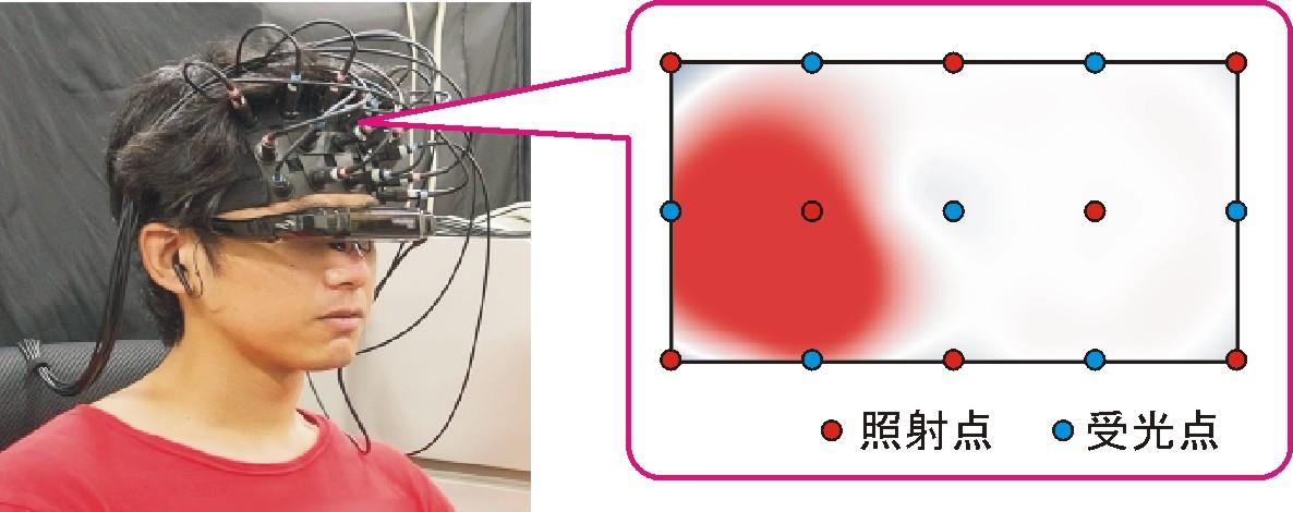 脳の活動は神経細胞の電気的変化ですが、運動、感覚、視覚、聴覚、言語、思考などの機能に対応して脳が活動する部位は異なっています。また、脳が活動すると、その周囲で血液量が局所的に増加することが分かっています。近赤外光は骨を透過して血液で吸収されるので、図2の写真に示すように頭表に複数のファイバープローブを装着して近赤外光を照射・受光すると、脳組織の様々な部位における血液量変化に応じた光量の減衰を検出することができます。この血液量変化の空間分布を脳の活動部位として画像化するのが、近赤外光による脳機能イメージングです。