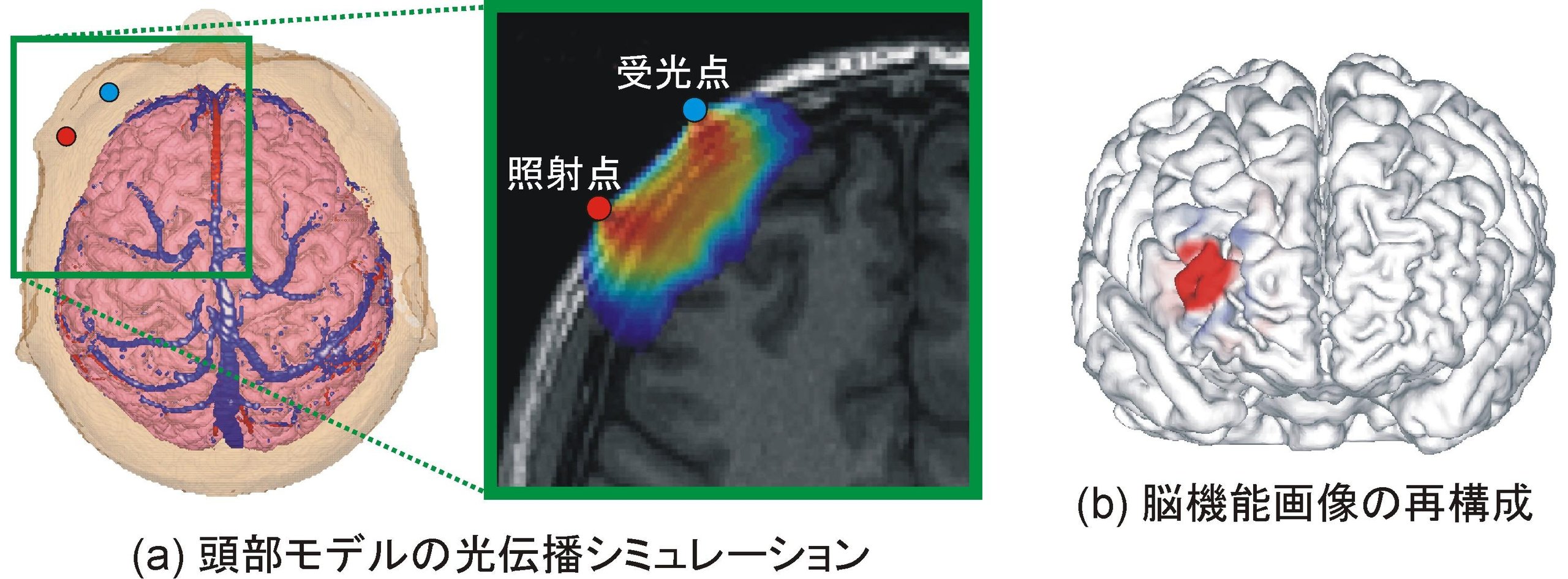 X線は、身体内部の構造を正確にイメージングできますが、脳活動による局所的な血液量変化のような機能に関する情報を測定することはできません。一方、近赤外光は生体組織で強い散乱を受けるため、X線の様に生体組織内を直進することはできません。したがって、近赤外光による脳機能イメージングは、霧の中で物を見ることに相当し、図2に示した画像における脳活動部位は、実際に脳が活動した領域よりも広がってしまっています。このことを解決するためには、頭表に装着したファイバープローブで照射・受光した近赤外光が脳組織のどのような範囲を伝播しているかという情報を用いて画像を再構成する必要があります。しかし、頭部組織内の光伝播を実測することはできません。そこで、図3(a)に示すように、頭部の解剖学的な構造を忠実に模擬したモデルをコンピュータ上で作成し、近赤外光の伝播をシミュレーションすることで推定する研究をおこなっています。シミュレーションの結果から、近赤外光が散乱されることにより脳組織の広い範囲を伝播していることが明らかになっています。また、脳組織中の光伝播は頭皮や頭蓋骨などの厚さなどにも影響を受けるため、正確なモデルを作成して精度の高い光伝播解析を行うことが重要となります。頭部モデルを用いた光伝播シミュレーションに基づいた画像再構成を行うことで、図3(b)に示すように、脳組織の構造画像上に正確に脳機能画像を得ることが可能になります。