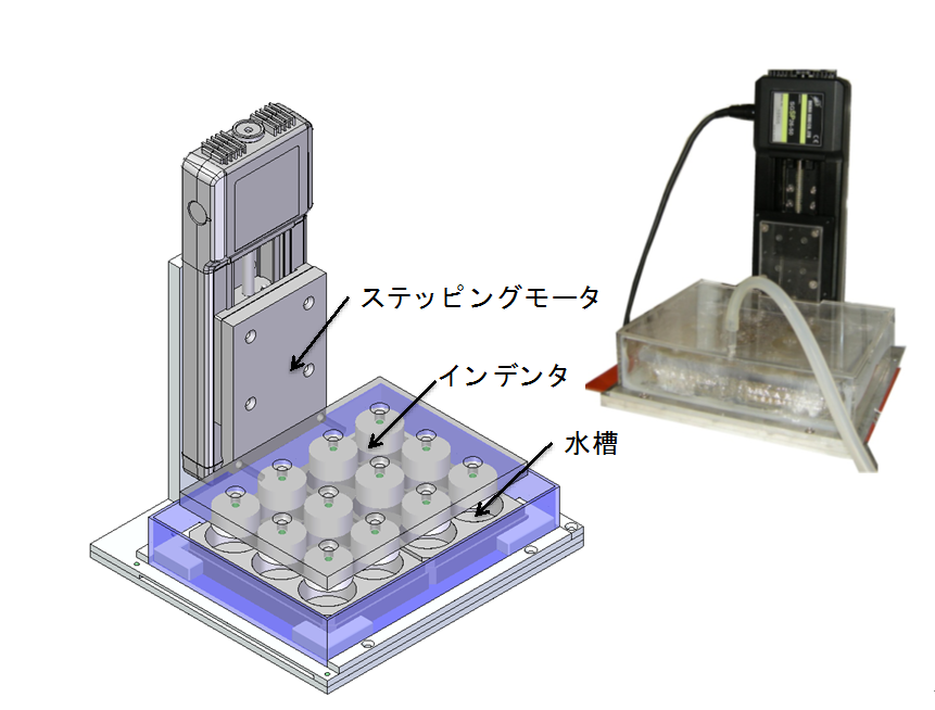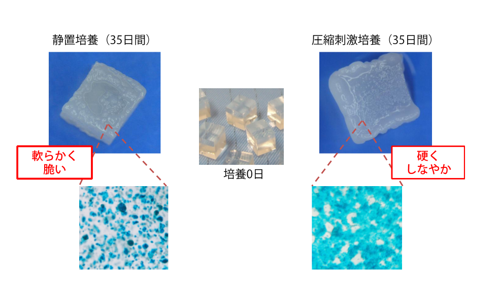 さて、このような関節軟骨の治療には生体外で細胞を使って軟骨組織を創り出す再生医療によるアプローチが非常に有効です。この方法では、健康な部位から少量だけ軟骨の細胞を取り出してきて、含水性の高いゲル(ハイドロゲル)の中に混ぜ込んで培養することで軟骨組織が再生します(図1)。このように細胞を培養する際にゲルやスポンジ状の物質を足場として三次元的に培養する手法は生体組織を再生する上で極めて効果的であり一般的に用いられる手法ですが、再生される軟骨の強度は元の生体にある関節軟骨の強度と比較すると10分の1かそれ以下の強度しか得ることはできません。そこで我々は細胞に刺激を与えながら培養する新たな方法を考案しました。関節軟骨の中にある細胞はヒトが日常的に歩行することによって毎日繰り返し圧縮力を受けています。そこで我々は軟骨細胞が埋め込まれたゼリー(ハイドロゲル)にヒトの歩行周期(大体0.5〜1Hzです)で圧縮変形を与えながら培養することのできる装置を開発しました(図2)。実際に、ヒトの細胞を用いる実験の前段階として、荷重形態がヒトに近い仔ウシの関節軟骨細胞を用いて歩行を模擬した刺激を与えながら培養して再生軟骨を作製したところ、その強度を2~3倍まで高めることに成功しました(図3)。まさにこのような装置の開発ができることこそ、細胞や生体組織の構造と役割を理解した上で機械工学のバックグラウンドを持っている研究室ならではの再生医療へのアプローチと言えるのではないでしょうか。