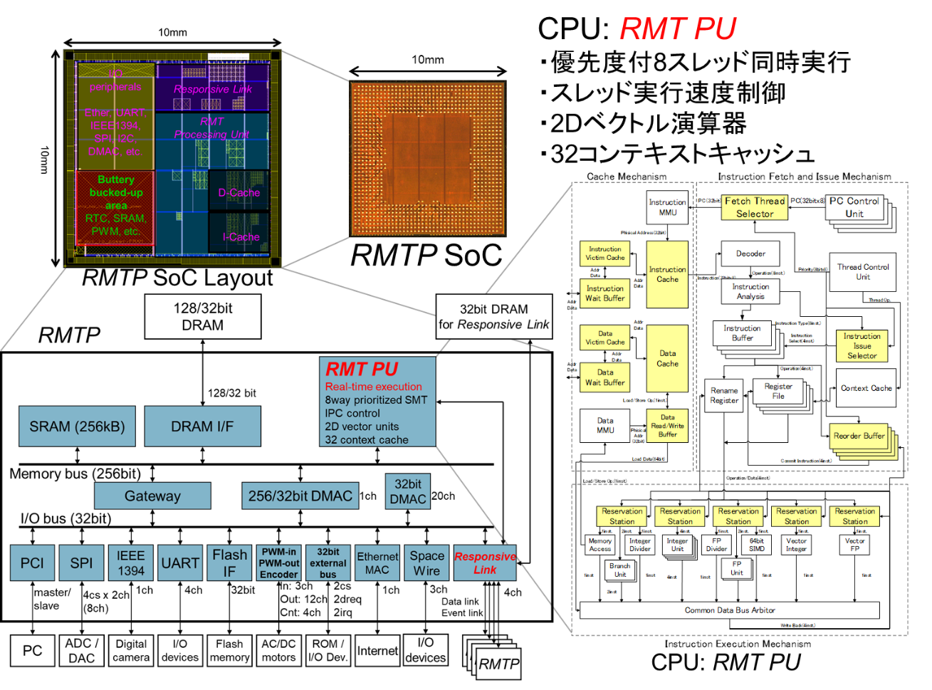 我々は、この組込み分野のインフラ側に着目して研究開発を続けています。具体的には、ハードウェアとしてはQoSを実現するマイクロプロセッサ(CPU)やネットワークの研究開発を行っています。リアルタイム処理用のマイクロプロセッサとしては、スレッド(プログラム)に優先度を付けて同時実行することで、リアルタイム処理をスケジューリング理論通りにオーバヘッドなく実現するRMT PU (Responsive Multithreaded Processing Unit)の研究開発を行っています。同様にリアルタイム通信としては、パケットに優先度を付けてノード毎に追い越すことによって、リアルタイムスケジューリング理論をそのまま通信にも応用可能なリアルタイム通信リンク(Responsive Link)の研究開発を行っています。Responsive LinkはISO/IEC 24740として国際標準規格として採用されています。さらには、それらのリアルタイム処理用CPU(RMT PU)やリアルタイムネットワーク(Responsive Link)、センサやアクチュエータを制御するためのインタフェース(I/O)、メモリ等を一つのVLSIとして実現するSoC (System-on-Chip) の研究開発を行っています。例えば、図1のResponsive Multithreaded Processor (RMTP)は10mm角のVLSIにこれらの機能を全て集積しています。