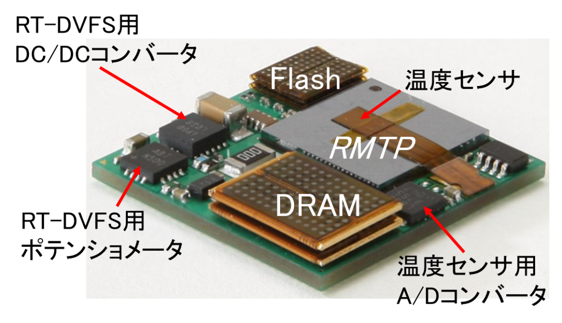 さらには、SoCに集積しきれない主記憶(DRAM)や永続記憶(フラッシュメモリ)、電源IC、各種センサ、コネクタ等を超高密度に集積した基板であるSiP (System-in-Package)の研究開発も行っています。例えば、図2のRMTP SiPは、PCのほぼすべての機能+リアルタイム処理機能+リアルタイム通信機能+各種I/Oインタフェースを20mm角に集積しています。