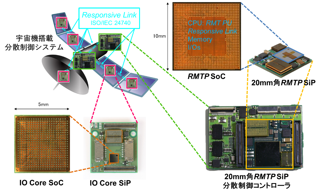 ここで、リアルタイム性というのは、速いとかすぐにという意味はありません。何らかの時間制約(デッドラインや周期等)がある処理をリアルタイム処理、同様に時間制約のある通信をリアルタイム通信と言います。我々は、リアルタイム性を実現するために、リアルタイム処理や通信に関する理論やアルゴリズムに関する研究を行うだけでなく、それらの理論に基づいた演算処理や通信のハードウェアアーキテクチャ、アルゴリズムに基づいたソフトウェアアーキテクチャ、スケジューラ、オペレーティングシステム等の研究開発を行っています。理論のみでもなく、ハードウェアのみでもなく、ソフトウェアのみでもなく、それら全てを同時に補完的に研究開発することによって、より実用的で高機能な実システムを構築できると考えています。そして、それらの研究成果をロボットや宇宙機等のハイエンドな組込みリアルタイムシステムに応用しています。図3は宇宙機の分散制御の例ですが、各センサやアクチュエータにそれらを制御するコントローラ(RMTPSoC/SiP)が組み込まれ、互いにリアルタイムネットワーク(Responsive Link)で接続され通信をしながら分散制御することで、システム全体が制御されます。さらに、これらの実システムから得られたデータを元にして、次世代の新たな理論やアーキテクチャの考案を行っています。これらが実現すると、様々なシステムを高品位に制御することが可能となります。