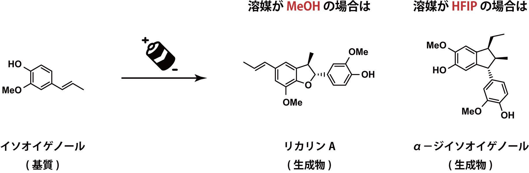 図2に示した私たちの最近の研究成果を例に、有機電解合成の魅力を簡単に紹介します。フェノール類の一種であるイソオイゲノール(基質)を陽極上で酸化する反応において、基質を溶解させる溶媒を替えると、全く別の生成物が得られました。溶媒にメタノール (MeOH) を用いると、抗炎症活性を示すリカリンAと呼ばれる化合物が主な生成物として得られましたが、溶媒にヘキサフルオロイソプロパノール (HFIP) を用いると、多彩な生物活性を示すα‒ジイソオイゲノールと呼ばれる化合物が単一の生成物として得られました。これは、陽極上での酸化反応によってできる反応中間体の構造や安定性が溶媒種によって大きく影響されるためだと考えています。このように、反応条件を少し変えるだけで生成物が劇的に異なることが有機電解合成の最大の魅力のひとつだと思っています。
