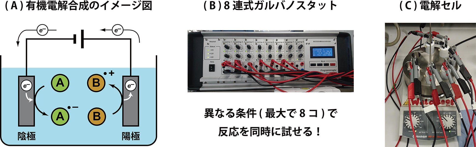 前置きが少し長くなりましたが、ここで有機電気化学の出番です。有機電気化学とは読んで字のごとく、電気化学を組み合わせた有機化学のことを指し、有機電気化学の概念や手法を利用したモノづくりのことを有機電解合成と呼びます。有機電解合成では、図1 (A) のイメージ図に示したように、原料(基質)の溶液に2つの電極(陰極と陽極)を浸して一定の電流または電圧を印加することで反応を進行させます。このとき、電極と基質との間での電子移動を通じて反応中間体ができ、この反応中間体が化学反応によって目的の化合物に変換されます。つまり、有機電解合成は電子そのものをあたかも試薬のように扱うため、特別な試薬を必要としないモノづくりの手法と捉えることができます。