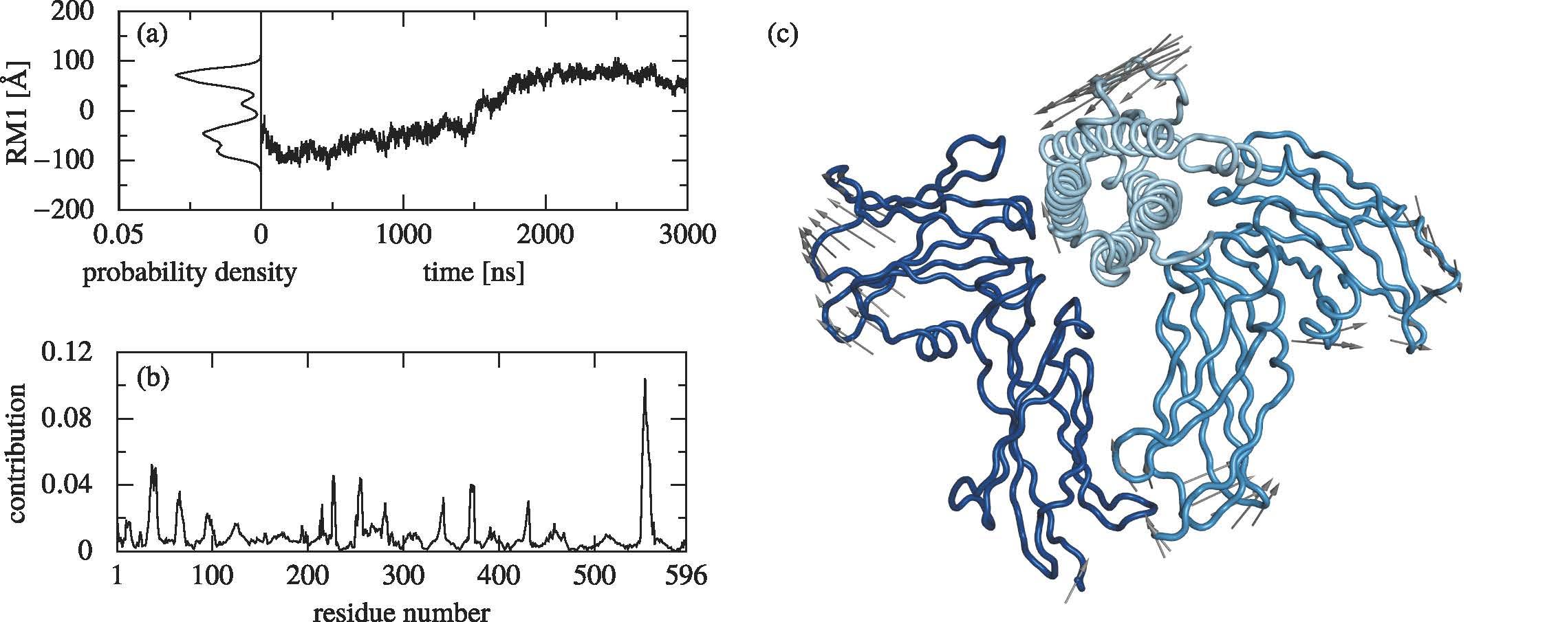 応用例を見てみます。次の図の(c)は、あるタンパク質分子1つと別のタンパク質分子2つが集まった複合体のシミュレーションから緩和モード解析で取り出した、最も遅い揺らぎの方向を示しています。図の(a)の右側は、その方向に射影した揺らぎの値の時間変化を示しています。シミュレーションの中で小さい値から大きい値へ1回だけ変化していることがわかります。緩和モード解析の方法により、このような「稀な出来事」を取り出すことができます。図の(b)は、タンパク質のどの部分がこの揺らぎに寄与しているかを示していて、特定の位置が大きく寄与していることがわかります。