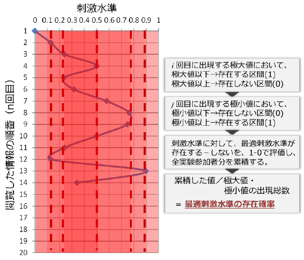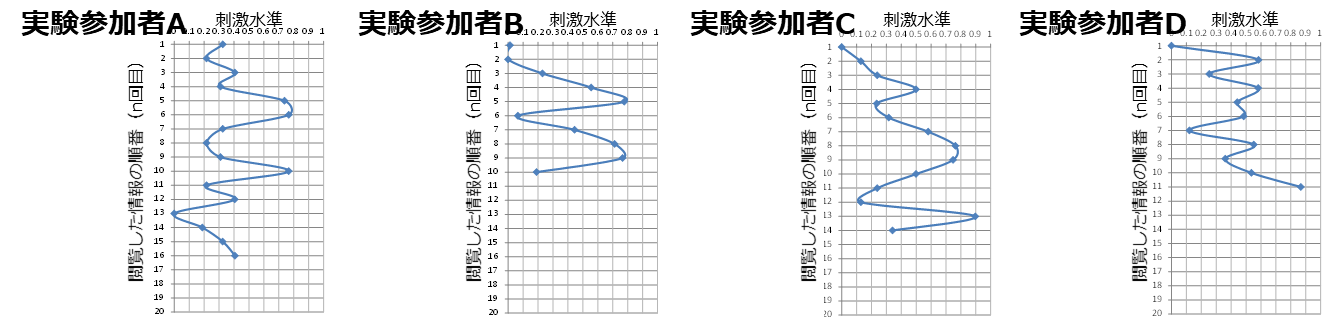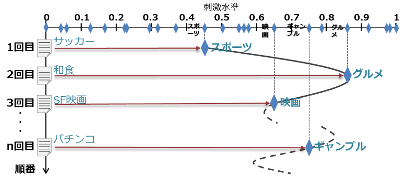 実験では、まず、人のブラウジングを観察しました。各実験参加者にはあらかじめブラウジングの対象となる情報のジャンル(24ジャンル)を対にして、それぞれどちらに対して馴染みが強いかを比較評価させ、この一対比較データを用いて実験参加者ごとの各ジャンルに対する興味・関心の強さを0-1の範囲で尺度化(Scheffe法)しました(図2)。すると、いずれの実験参加者も弱い刺激と強い刺激を行ったり来たりしながら情報探索を続けるパタンをとっていたことがわかりました(図3に例示)。全15名の実験参加者の情報探索の遷移を分析すると、最も馴染みのあるジャンルを0、最も馴染みのないジャンルを1としたとき、遷移の往来の軸は刺激水準0.3-0.4であるケースが確率的に最も高いこと(図4)、また、ブラウジング中、実験参加者の脳機能計測を行ったところ、ヒトの興味・関心の強さを反映するとされる前頭前皮質背外側部・内側部のOxy-Hb濃度長変化量は、刺激水準0.3-0.4のジャンルの情報を閲覧しているとき最も増大していたことも明らかになりました。その他、実験参加者がブラウジングから離脱しない確率が高い条件は、刺激水準0.15-0.8の範囲で、n-1個目とn個目の刺激水準の遷移差が増加方向であれば0~0.15、減少方向であれば-0.5~-0.35であることもわかりました。