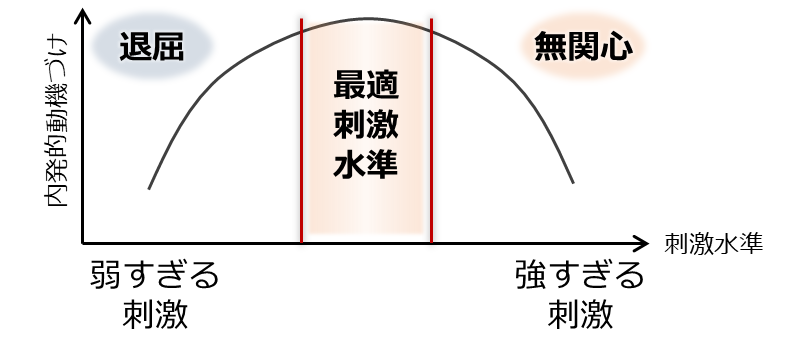 人間の興味・関心は、心理学的に言う内発的動機づけ(intrinsic motivation)の一種です。人間には、報酬や罰による動機づけ(外発的動機づけ)だけでなく、行動そのものが目的となる動機づけ(内発的動機づけ)があり、後者の方が思考力、集中力、直感力、創造力などの面で優れていることが多くの実験から示されています。この内発的動機づけに関して、最適刺激水準理論(Berlyne, 1960, 1965, 1971)と呼ばれる面白い理論があります。内発的動機づけは刺激水準に対して逆U字型の関係になるというもので(図1)、人間は強すぎず弱すぎない刺激水準、すなわち最適刺激水準のものに対して、より強い内発的動機づけが引き起こされる、ということを意味しています。このことは、経験的にも理解しやすいもので、例えば、映画や小説を選ぶとき、私たちは自分の嗜好とはかけ離れたジャンルのものでもなく、自分が既に良く馴染んだジャンルのものでもない、自分の好みや知識からちょうどよくズレたジャンルのものに対して「観てみようかな」「読んでみようかな」と関心を向けがちですし、また、これから跳び箱を飛ぼうというそのとき、自分が飛べる段数に対して高すぎる跳び箱は挑戦する気がしない、けれどもう自分が飛べる段数に対しては挑戦のしがいがなく、自分の能力からちょうどよくズレた高さの跳び箱に対して「よし一丁やってやろう」というやる気に繋がるものです。