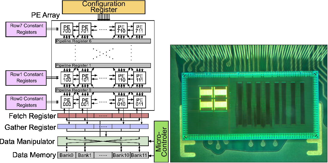 DSAは特定の分野に限って性能を実現すれば良いですし、クラウドコンピューティングの発達で、特殊で高額なシステムも多人数で共有することで商業的に成功することができます。このため、シストリックアレイ、ロジックインメモリ、アナログニューロなど今まで研究レベルでしか使われなかったアイディアが次々に実際のチップとなって使われています。Google, Amazonなどの巨大クラウド企業は、深層学習用の新しいコンピュータを自ら開発してクラウドで利用し、エッジ分野では、野心に燃えた起業家が新しい発想のチップを作ってどんどん市場に投入しています。プログラム格納型コンピュータ誕生以来70年を経て、我々はようやくコンピュータアーキテクチャ多様性爆発の時代を迎えようとしているのです。天野研究室は、超並列処理と再構成可能なハードウェアというアプローチで、この時代を切り開いています。図1は我々の開発したCMA(Cool Mega Array)という新しいアーキテクチャの構成図とチップです。競争は激烈ですが、対象分野も広がっており、誰にでも成功のチャンスはあるのです。