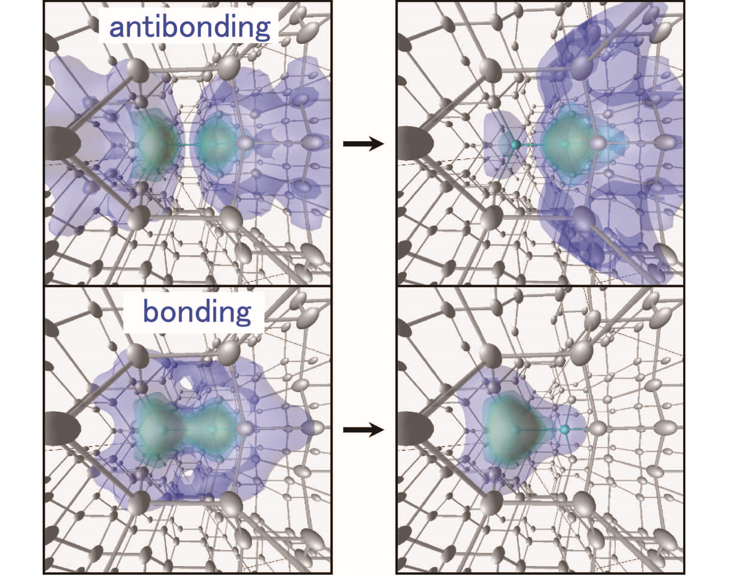 私の研究室では内殻電子によるX線光電子分光スペクトルの高精度計算を行って、半導体中の不純物原子の形態を調べています。X線光電子分光というのは、X線を試料に照射して、飛び出してくる電子の運動エネルギーを測定し、その電子が元居た原子の状態を調べるものです。図に、シリコン(Si)半導体中の隣り合う2つの砒素(As)原子の電子状態を示します。光電子はAs原子の内殻3d軌道から放出されます。左(右)側が電子放出前(後)の状態です。後の状態は、電子がいなくなることで、実質的にプラスの電荷が存在するのと同じ効果があり、周りの電子がそのプラスの電荷に引き寄せられていることがわかります(右下の図)。このように電子放出の前後で、その電子の周りの状態は大きく変わります。面白いのは、電子が飛び出した後の状態がどうなろうが、飛び出した電子には関係ないように思われますが、多くの場合、飛び出した後の状態を計算に含めないと実験をよく説明する結果になりません。これは量子力学的効果によるものと考えられています。