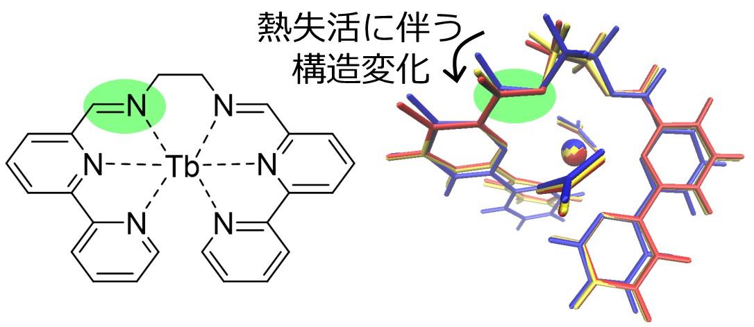 実際に、これらの手法が研究の現場でどう使われているかを説明するために、発光材料の開発プロセスに注目してみましょう。図1(左)のテルビウム(Tb)化合物は、緑色の発光を示しますが、その強度は微弱です。ここから、強い発光を示す化合物を開発するには何から始めるのが良いでしょうか?一つ目の方法は、Tbのまわりの分子(配位子と呼びます)を少しずつ変えた化合物を合成してみるというやり方です。でも、どこを変えるのがゴールへの近道か分からない状態で闇雲に実験を繰り返すのは、なかなか大変です。(ただし、このような実験の繰り返しの中から思いもよらぬ成果が得られたりするので、実験の繰り返しはとても大切です。)次に、発光の強さを決める要因に着目します。分子が光を吸収することでエネルギーを得た後、そのエネルギーを光または熱として放出します。前者は発光、後者は熱失活と言います。理論研究の積み重ねから、発光の起こりやすさが配位子にあまり依存しないのに対し、熱失活の起こりやさすは配位子によって大きく変化することが分かっています。つまり、発光強度を制御するには、熱失活の起こりやすさを制御すれば良いわけです。ここまで来たら、次は計算科学の出番です。失活過程における構造やエネルギーの変化を、コンピュータを用いて計算します。その結果、図1(右)に示す通り、C=N二重結合部分の面外変角振動が熱失活の原因となっていることが分かりました。実際に、C=N二重結合部分を単結合に置き換えるだけで、発光強度が著しく向上することが確認されています。