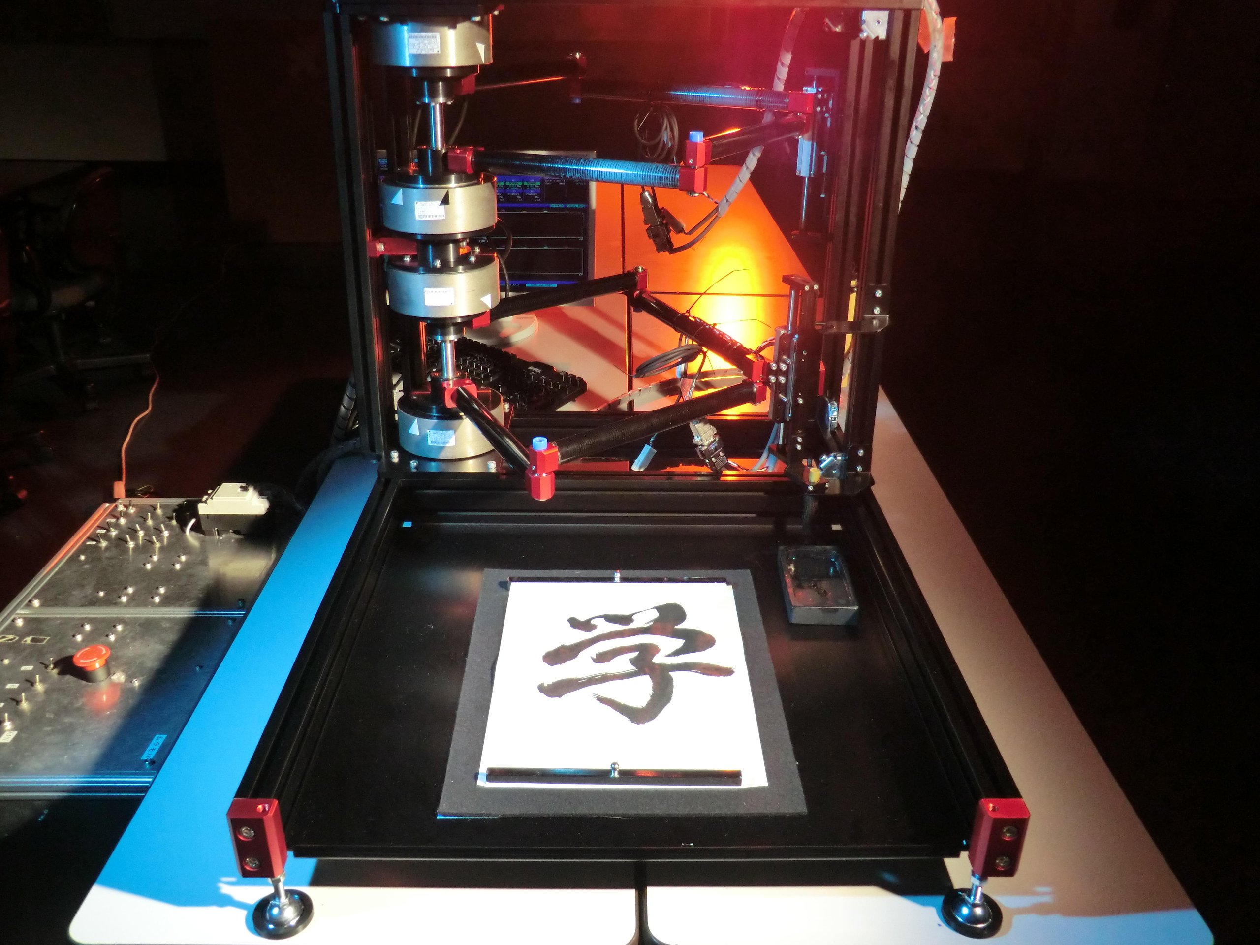 また、ロボットにより人間の運動を再現させる試みにも応用してきました。人間の運動の再現は、空間を移動させるための速度と対象へ加える力のそれぞれの情報を抽出し、ロボットで再現させることが必要になります。速度の制御と力の制御は、「双対性」という相反する性質を持っています。このことは、電気回路の「電圧源」と「電流源」の持つ性質と同じです。双対性を有する物理量同士は掛けるとパワー(動力、電力)となり、割るとインピーダンスとなります。さらに、加速度に注目することで、速度と力の両者を統合し、同時に再現することができるようになります。この考え方を図に示す書道ロボットに導入し、書の達人の揮毫のロボットによる再現に成功しました。