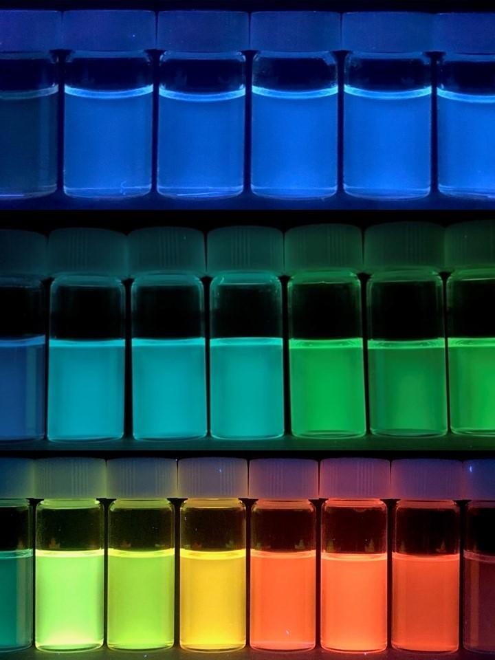 10 nm以下のサイズの量子ドット蛍光体は1990年代に登場しました。量子ドットは300℃以下の溶液中で作られます。高沸点の長鎖アルキル鎖をもつ表面修飾分子を含む溶媒中へ、原料を溶解した溶液を注入し、均一なサイズの単結晶ナノ粒子を瞬時に析出させます。表面修飾分子は、ナノ粒子表面へ吸着し、粒子の成長を抑制する役割と、アルキル鎖による立体的な反発により溶媒中での粒子の凝集を抑制し、安定な分散性をもたらす役割を果たします。このように、量子ドットは「ナノサイズである」、「溶液中で作る」ということから、上述の業界の常識では考えられない材料でした。