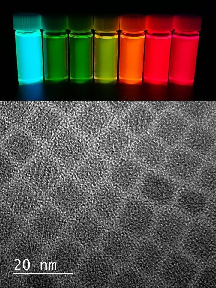 量子ドットは単結晶で、結晶内部に欠陥を含みません。しかし、表面原子は隣接する原子がなく、結合が切断された状態であるため、発光の効率が低下する原因になります。この問題を解決するために発光するコアの表面にシェルをエピタキシャル成長させます。この際、コアとシェルの結晶構造は同一とし、コアとシェルの界面で欠陥が生じないように、格子定数のミスマッチは極力小さくすることに留意する必要があります。量子ドットは、価電子帯の電子が伝導帯へ励起され、価電子帯に形成された正孔と伝導帯の電子が再結合することによって、バンドギャップ(Eg)に相当するエネルギーの光を発します。コア/シェル構造の量子ドットでは、コアを効率よく光らせるために、コアのEgをシェルのEgで挟み込む電子構造が設計されています。量子ドットの魅力的な発光特性として、「発光ピークは単一かつシャープである」、「サイズや元素組成の制御によって発光波長(発光色)を調節できる」が挙げられます。ディスプレイ用の量子ドット蛍光体は、研究開始当初はCdSe/ZnSでしたが、Cdの毒性が問題視され、その後InP/ZnSが開発されています。さらに、ペロブスカイト材料CsPbX3(X = Cl, Br, I)やナノ炭素材料(カーボンドット)などの量子ドットも新たに登場し、ますます進化しています。私たちの研究室でいっしょに量子ドット蛍光体を研究してみませんか?