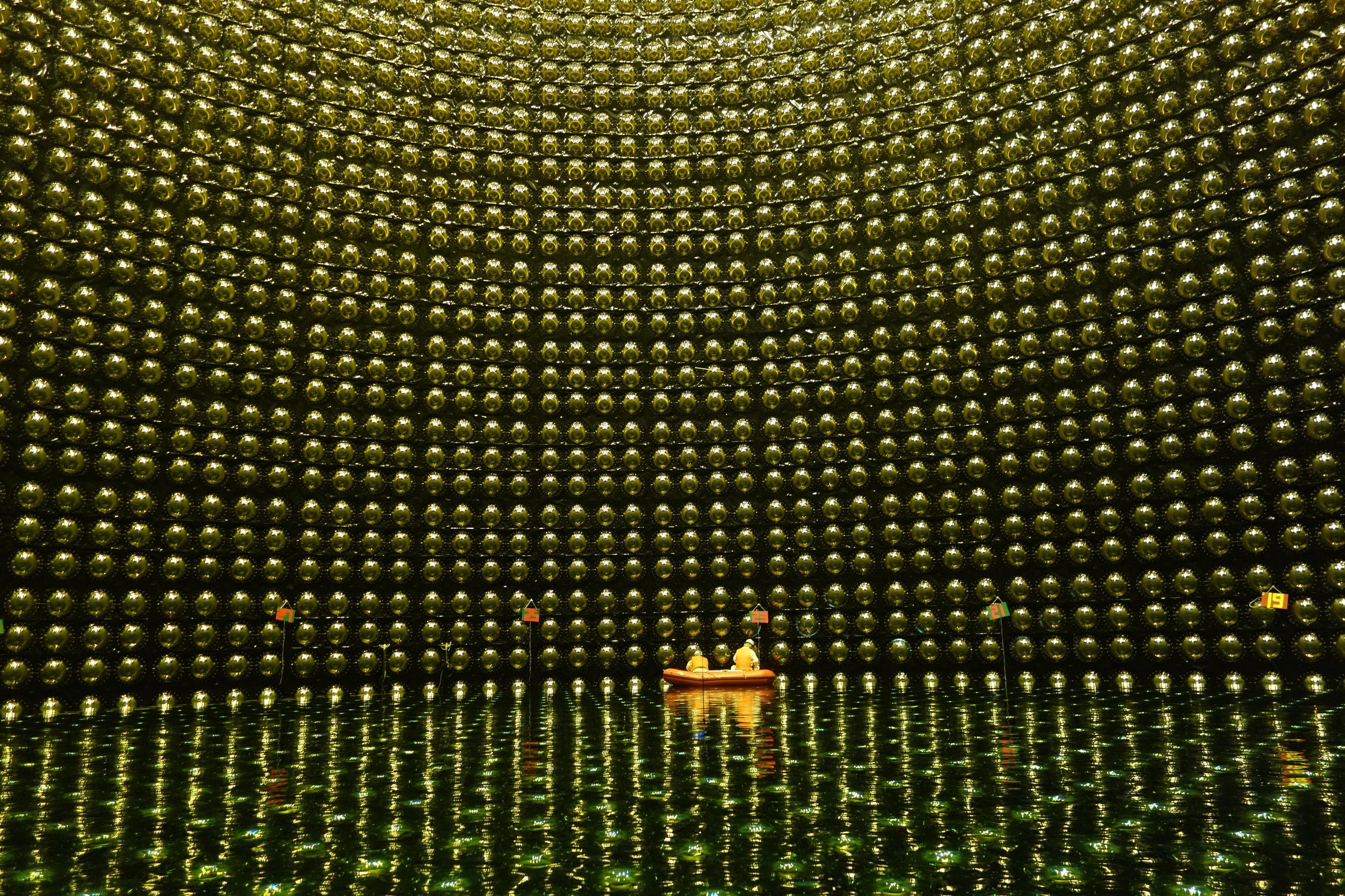 素粒子は種類によって受ける力の種類と大きさが異なり、力が弱い素粒子には気づくことができません。素粒子の1種であるニュートリノは質量が非常に小さく、周囲に力がほとんど及びません。宇宙から1秒間に数百兆個ものニュートリノがわたしたちの体を通り抜けていますが、そのほとんどが地球も通り抜けてしまうほどです。しかし、たまたま力が及んで見える瞬間を捉えられたら、その性質を研究することができます。このために、直径・高さがそれぞれ約40メートルの大きな円筒形タンクで5万トンの水を用いる検出器が「スーパーカミオカンデ」です。たまに止まるニュートリノを光で捉え、1日に約30個のニュートリノを観測することができます。